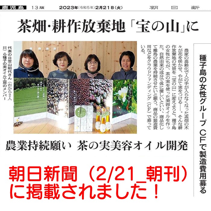 本日の朝日新聞朝刊に、種子の実オイル工房の挑戦が掲載されました!