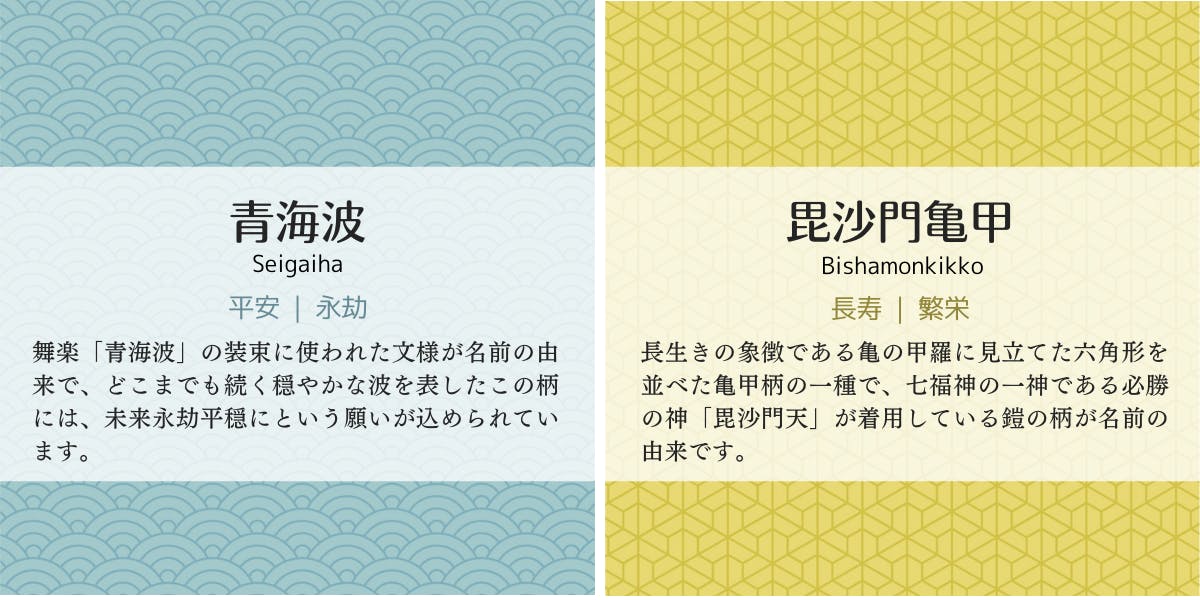 □四角と△三角の二つの形と、亀甲花菱、麻の葉、紗綾型の三つの柄を組み合わせてお選びいただけます。