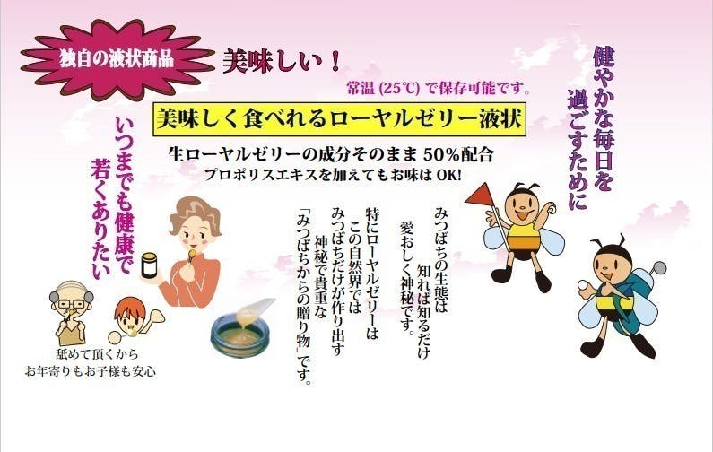 ローヤルゼリーやプロポリスは、独特なにおいや味で召し上がりにくい特徴を持っています。そのため続けたいと考えていても途中で止めてしまうことがよくあります。試行錯誤の中で『美味しく召し上がることのできる常温保存可能なローヤルゼリー液状商品』を作り上げました(私たちの商品でも苦手だと言われる方はいると思いますが。。。)