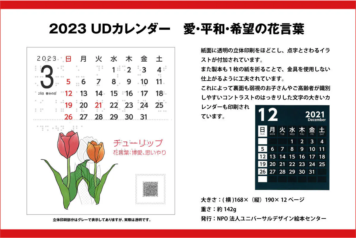 来年2023年版UDカレンダーのテーマは「愛・平和・希望の花言葉」をテーマにしています。