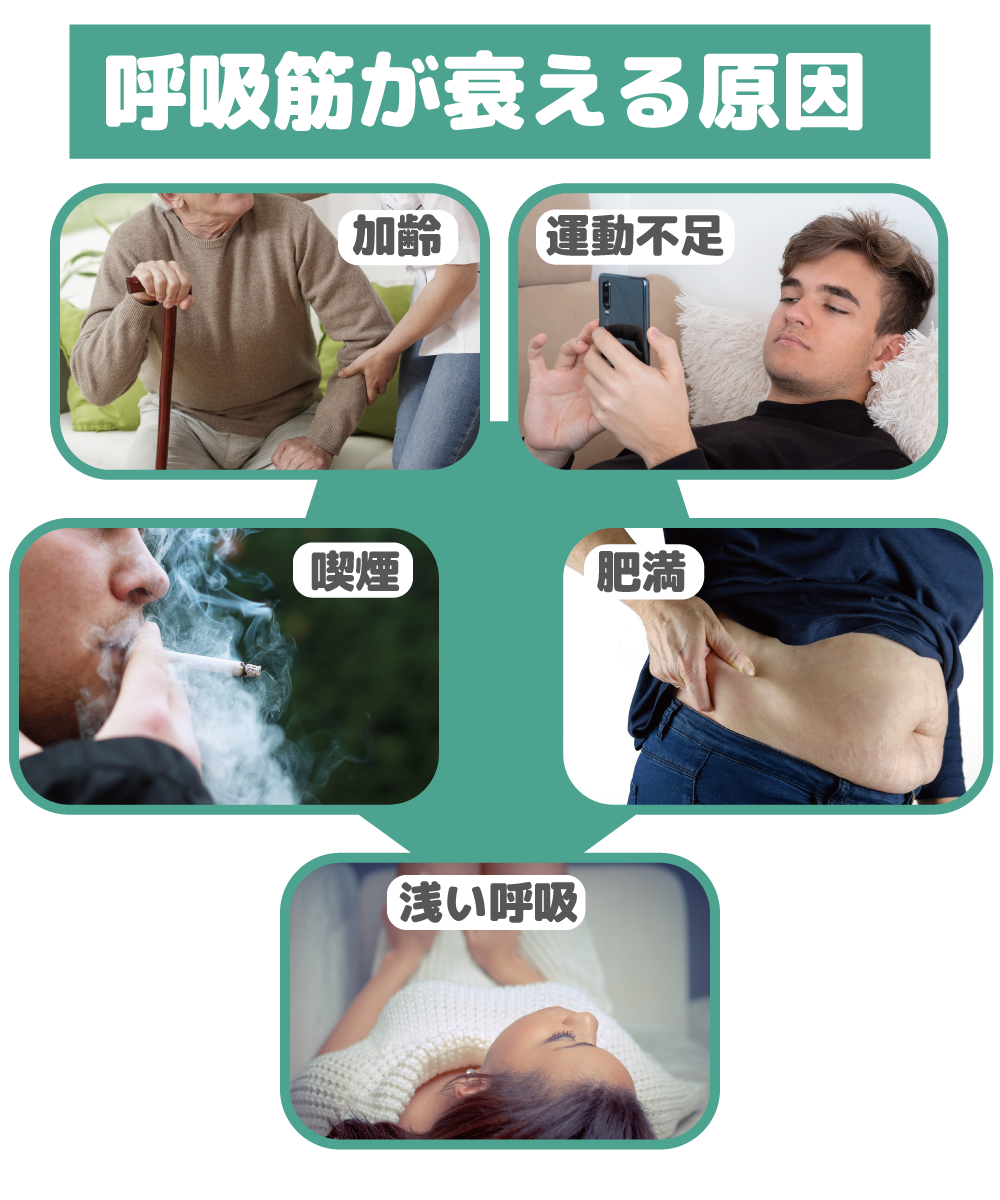 他の筋肉が衰えるのと同様に、加齢や運動不足、肥満、喫煙、普段から呼吸が浅いなど、様々な理由で呼吸筋も徐々に衰えていきます。