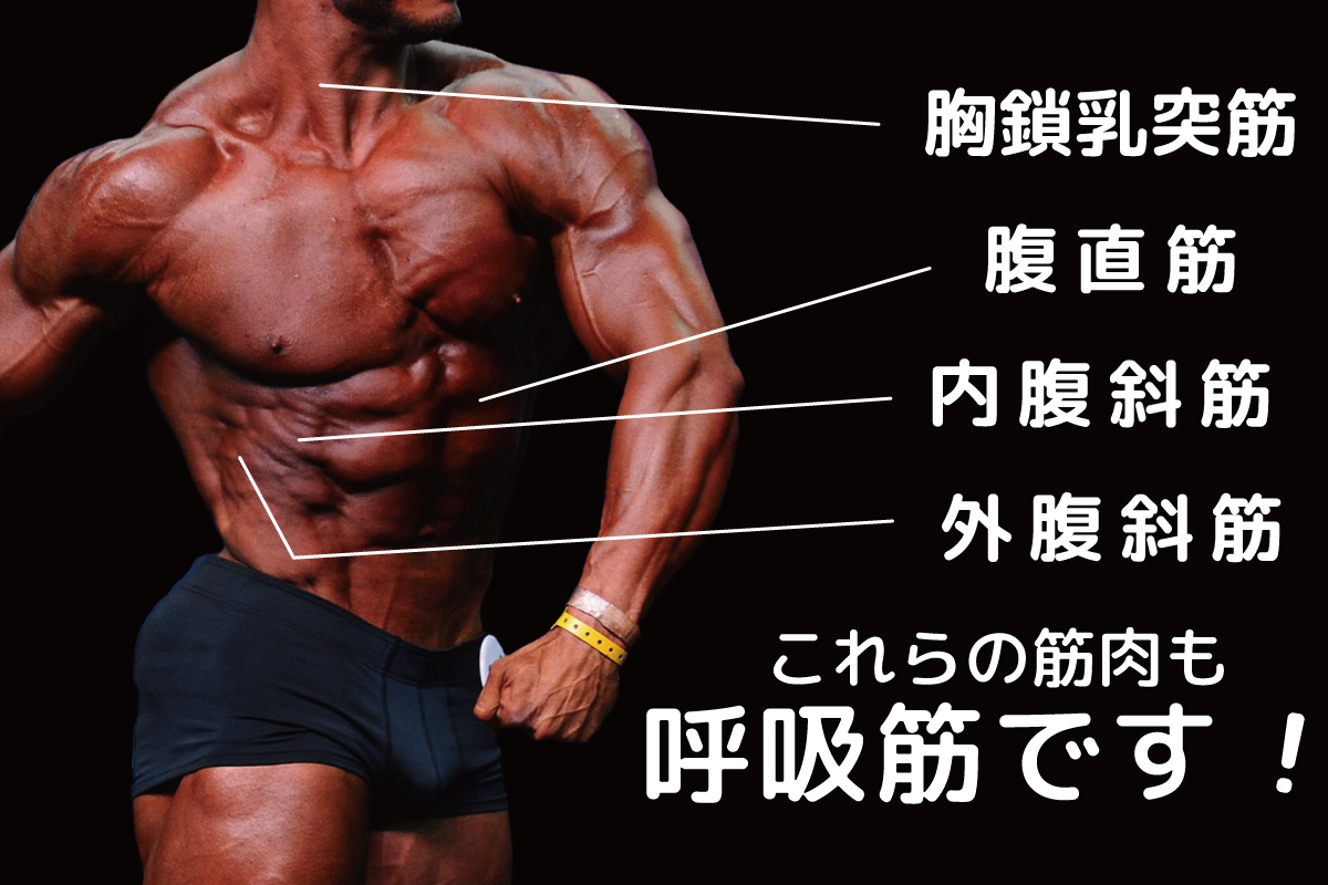 肺の拡張・収縮を司る呼吸筋は代表的な横隔膜以外にも、内肋間筋、外肋間筋、胸鎖乳突筋、前斜角筋、中斜角筋、後斜角筋、腹直筋、内腹斜筋、外腹斜筋、腹横筋など様々な筋肉を含みます。