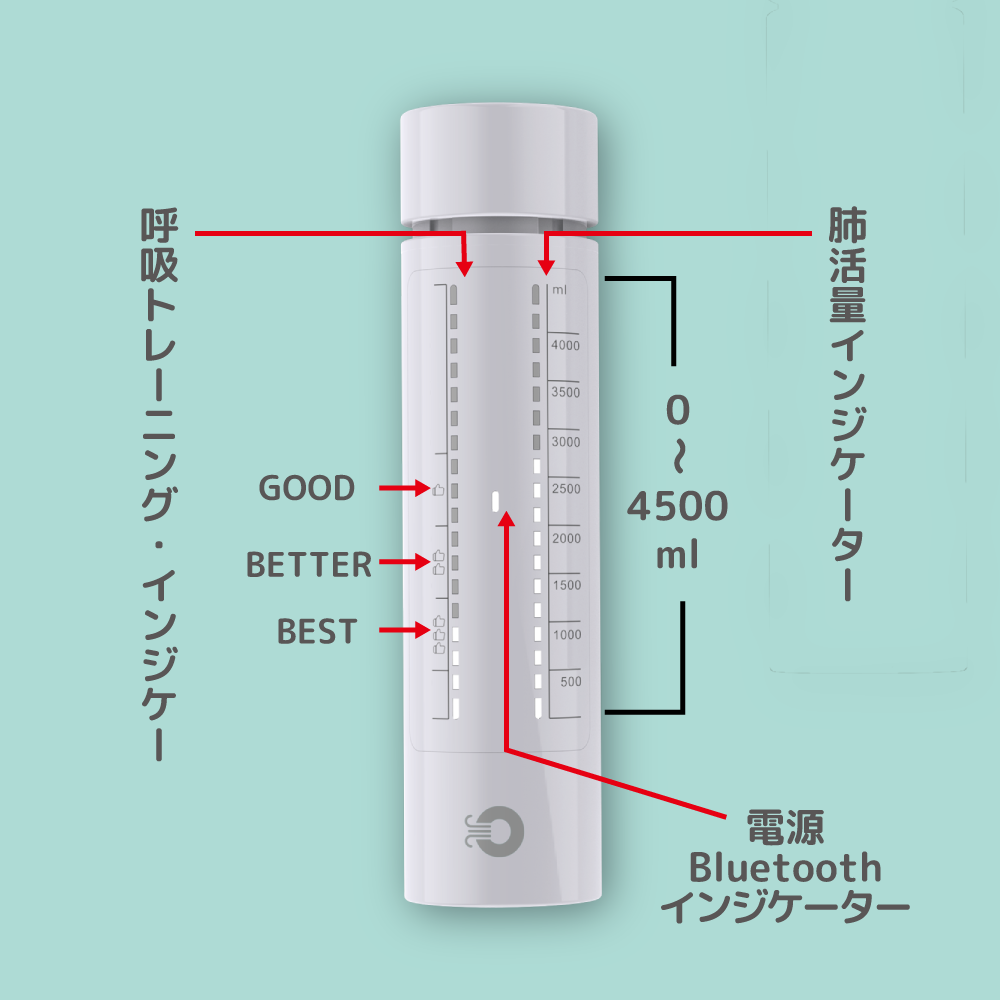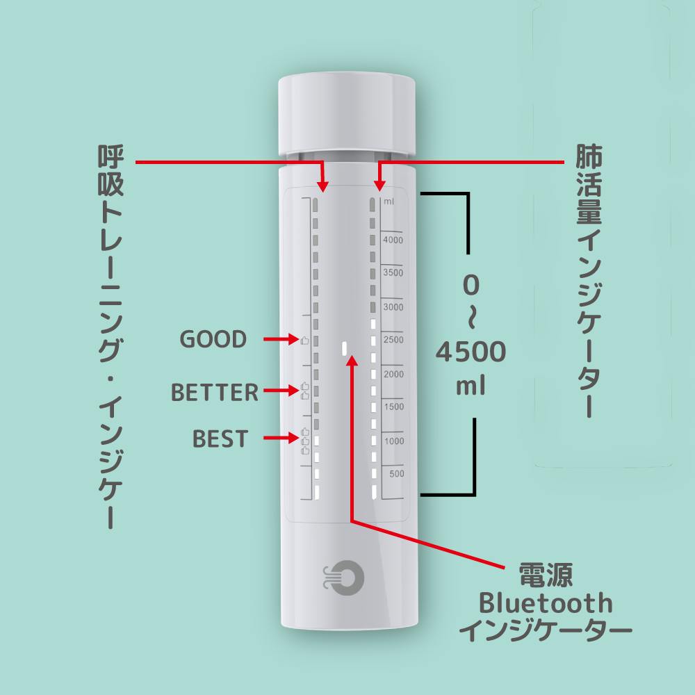 ⑤肺活量、及び現在吐いている(或いは吸っている)息の量は本体側面にあるインジケーターに表示されます。「BEST」までLEDランプが上昇ように頑張って呼吸してください。