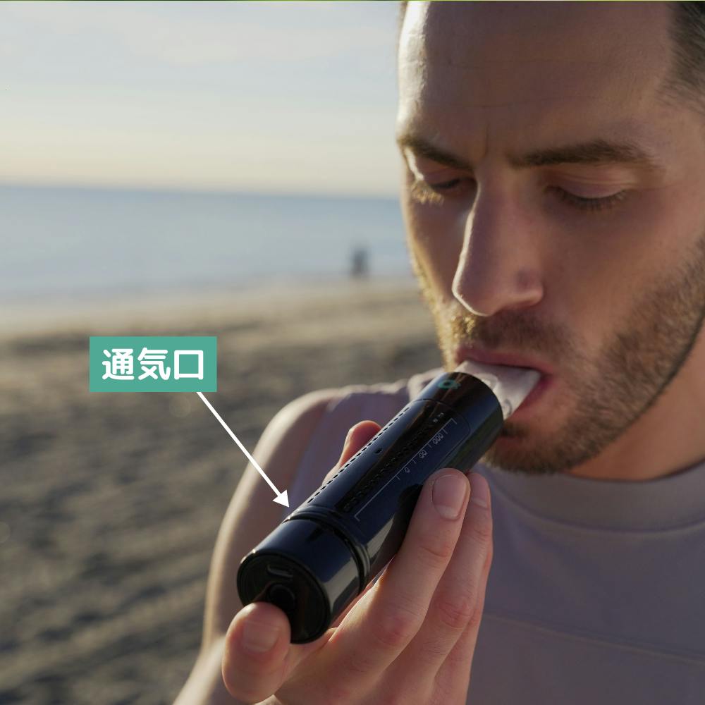 ④マウスピースに口を当て、ゆっくり且つ力強く肺にある空気を全て吐き出します。全て吐き終わったら、今度はゆっくりと息を吸い込み空気で肺を満たします。