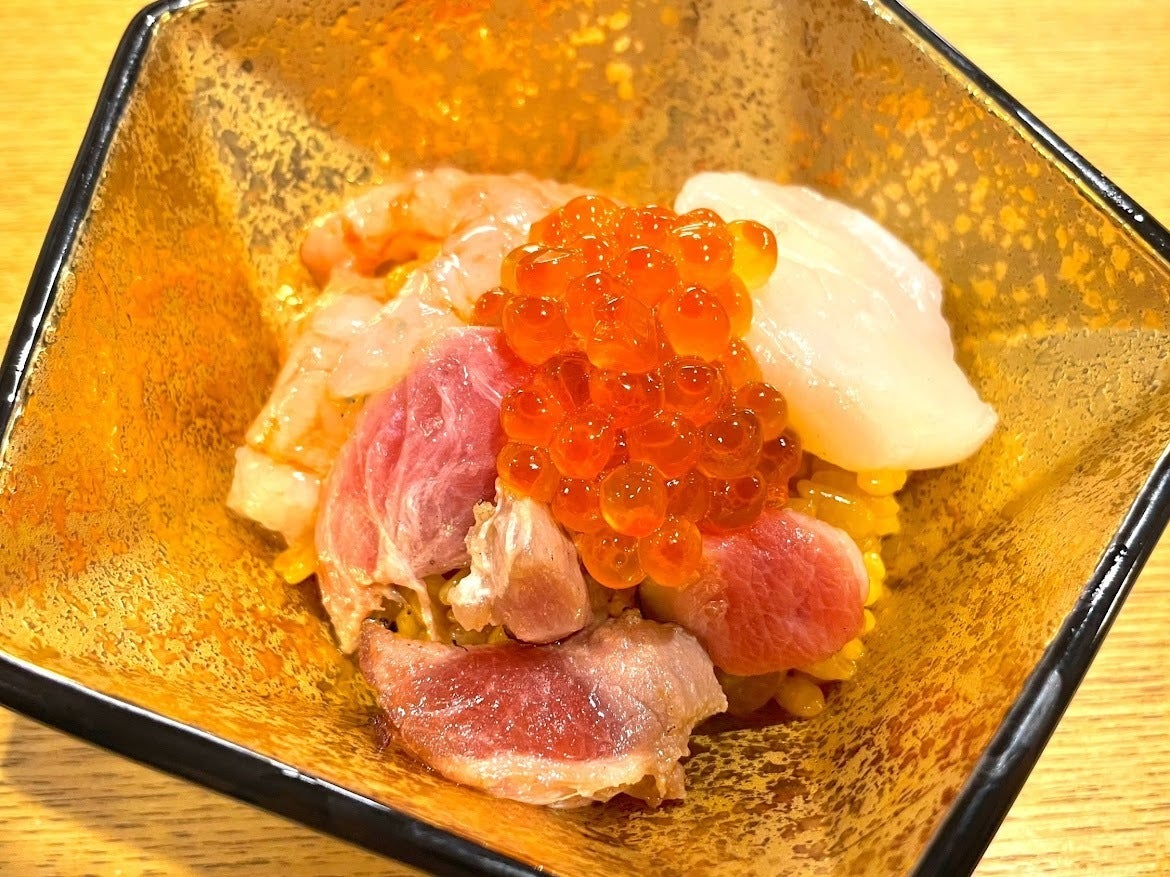 1品目はご挨拶代わりの「大将小鉢」。大トロ、ホタテ、甘エビ、イクラなどなど、高級食材が夢の共演を果たしたスペシャリテです。