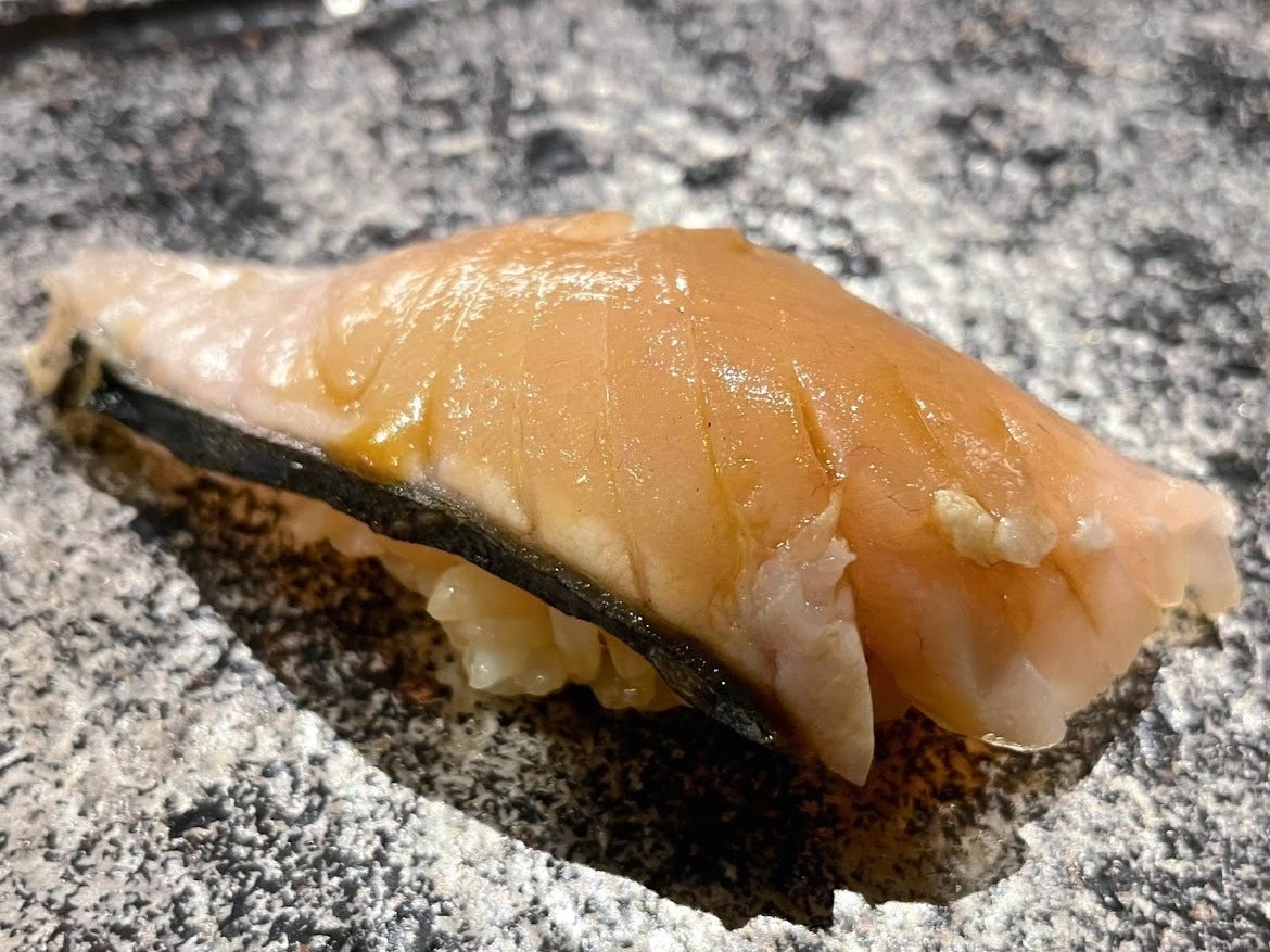 サワラの炙りをサクラチップで軽くスモークした、味わい深い握り。煮切り醤油を付けてあるのでそのままどうぞ。