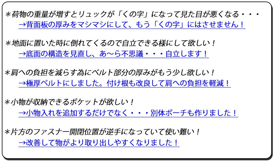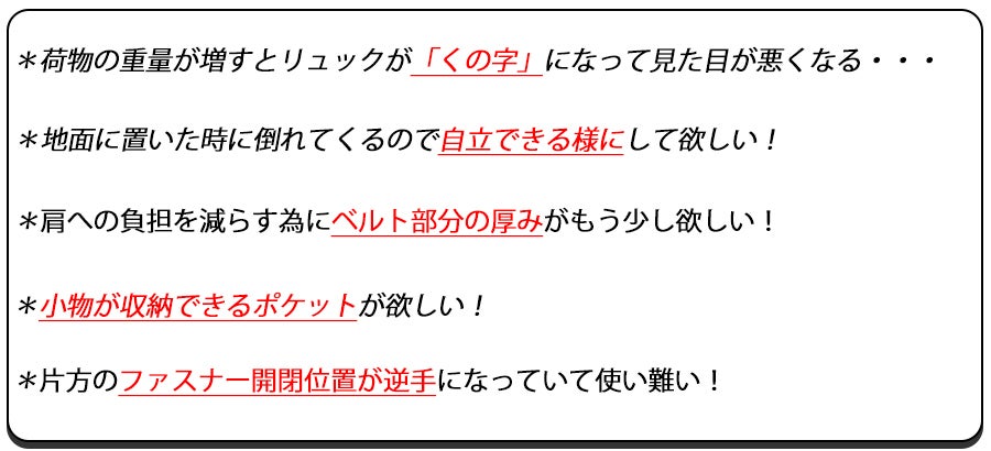 今回、ユーザーからのリアルな要望でより【使い勝手の良い】リュックを再開発しました。