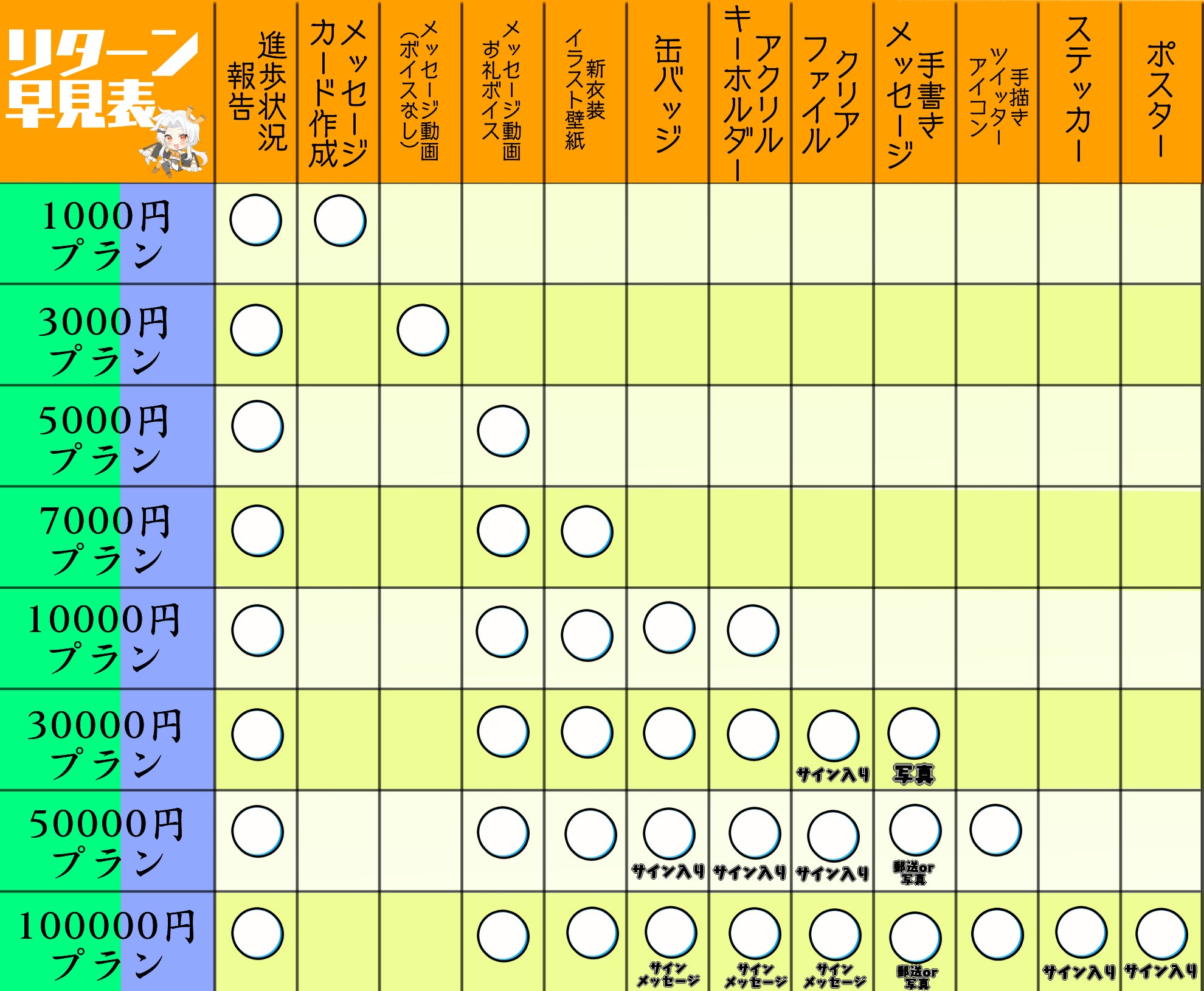 ↓こちらリターン品の早見表になります!!↓