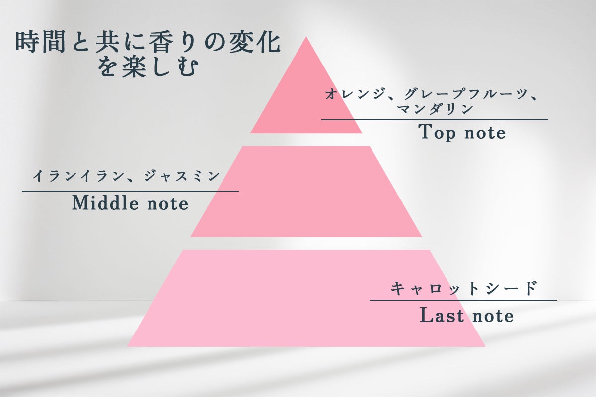 トップで香り立つのは、リフレッシュ効果のあるオレンジやマンダリンを基調とした、甘くフルーティーな香り。次第に、甘く優美な花々の官能的なフローラルの香りへと移ろいます。