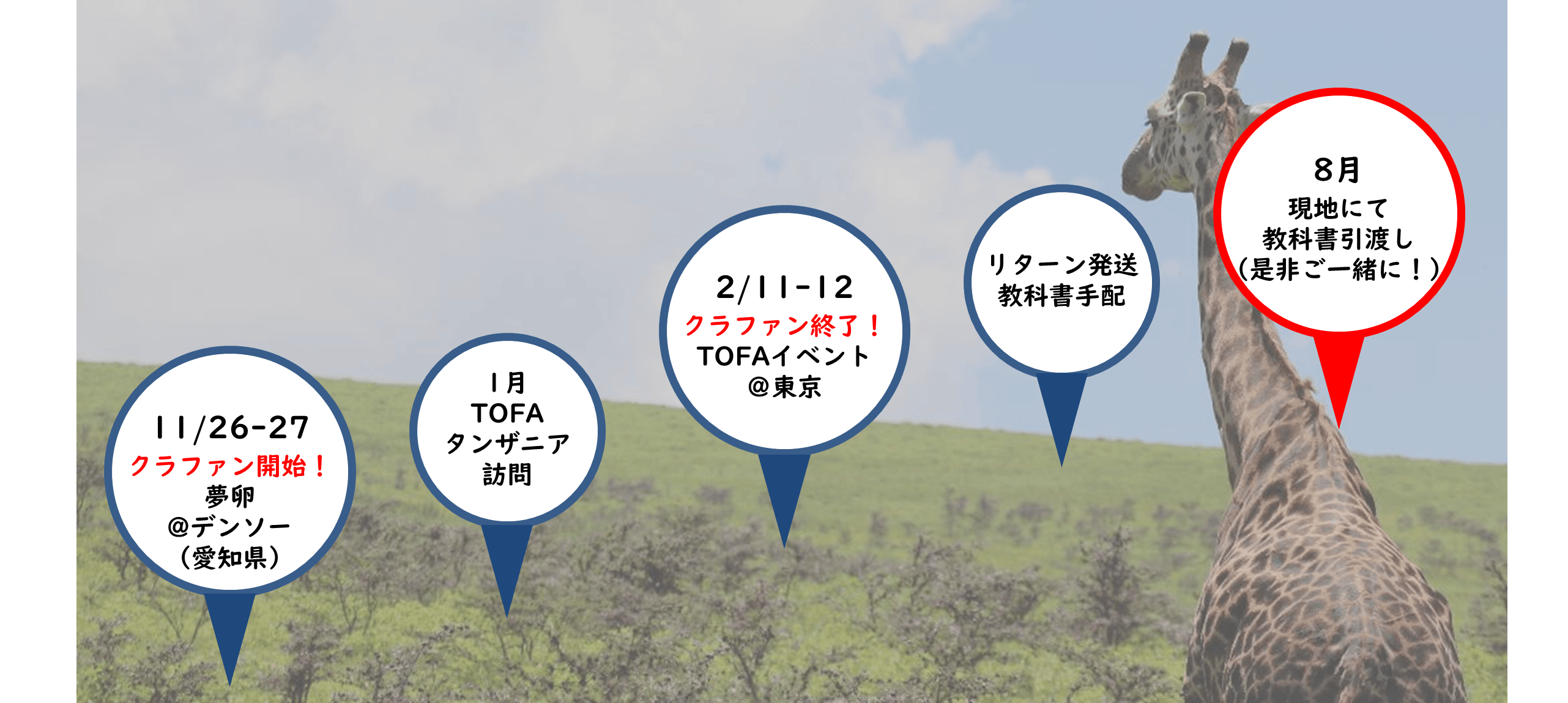 このプロジェクトは、多くの人にタンザニアの現状を知ってもらい、賛同者と共に教育環境を長期的、継続的に改善していくものです。TOFAでは、多くの方々とコミュニケーションを図るため、株式会社デンソーで実施される「夢卵(ムーラン)2022(11月26-27日、名古屋)」にハートフルフレンドチームの1つとして参加する日を皮切りとしてクラウドファンディングを同時スタートいたします。クラウドファンディングの終盤では、2月11-12日に東京にてTOFA独自のイベント開催し、最後まで継続的にコミュニケーションを取っていく予定です。