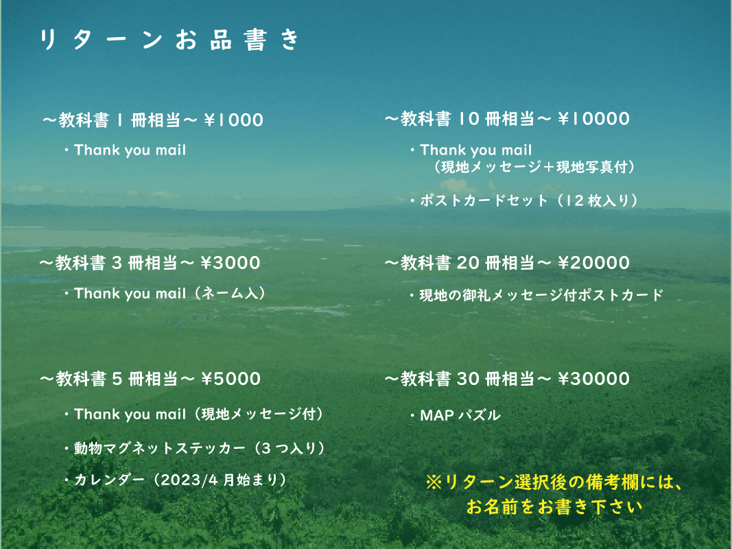 クラウドファンディングで集めた支援金はタンザニアへ送金し、現地で教科書を購入いたします。8月には再度、理事をはじめとしたメンバーで現地を訪れ、教科書の贈呈式、保護者や生徒、教員と意識改革の為の話し合いを行います。