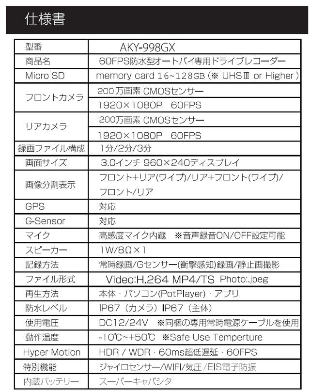 日本で人気のカーレコーダーブランド「AKEEYO」から、最高傑作「AKY-998GX」が登場。「AKY-998GX」は、カーレコーダーへの期待に応えます。"あったらいいな "が現実に!初めてのバイクレコーダーも、買い替えも、これが究極の答えだ! 初めての人も、買い替えの人も、これで決まり!