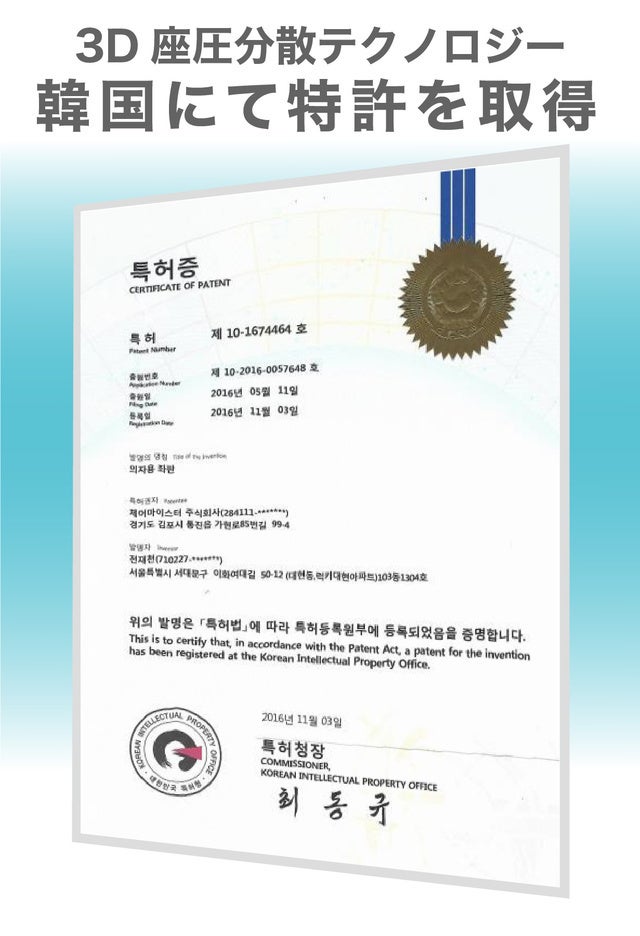 3D座圧分散テクノロジー(韓国特許登録済)により座圧を3Dで吸収・分散させ、快適な座り心地を実現。