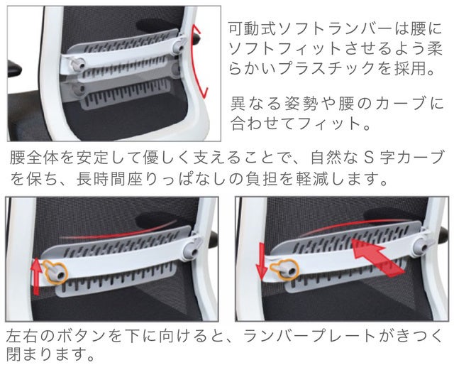 A2.柔らか素材で腰にソフトフィットし、座りっぱなしの負担を軽減します。可動式ソフトランバーは柔らかいプラスチックを採用しているので、異なる姿勢や腰のカーブに合わせてフィット。腰全体を安定して優しく支えることで、自然なS字カーブを保ち、長時間座りっぱなしの負担を軽減します。左右のボタンを下に向けると、ランバープレートがきつく閉まります。