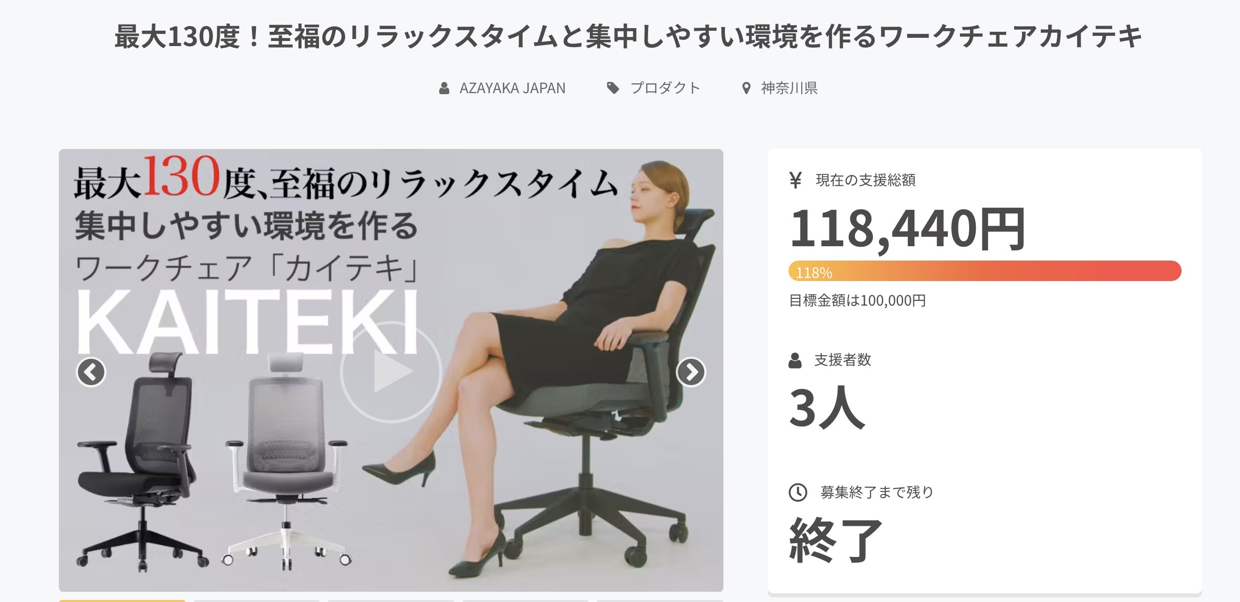 ※リターン品の配送が完了するまで、AZAYAKA JAPAN(実行者)はチェアマイスター社(メーカー)の日本における独占販売権を有する正規代理店です。※