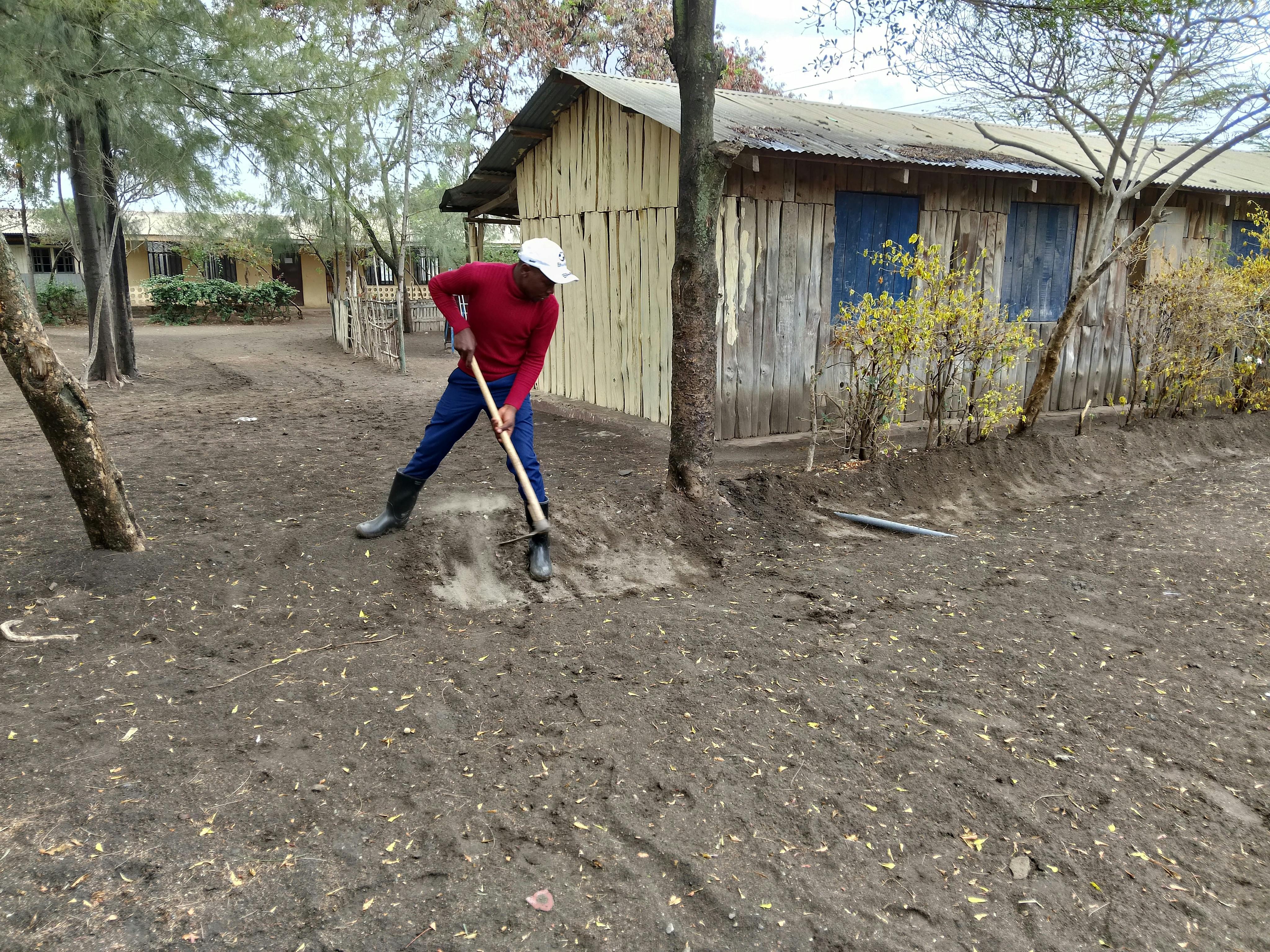 サイディアフラハスタッフのドミニックくんに、雨季の大雨に備えて溝をこしらえてもらっている。ごくわずかな雨だったので、地面の下はまだ湿っていずに乾いている。溝の白い部分は乾いているところ。