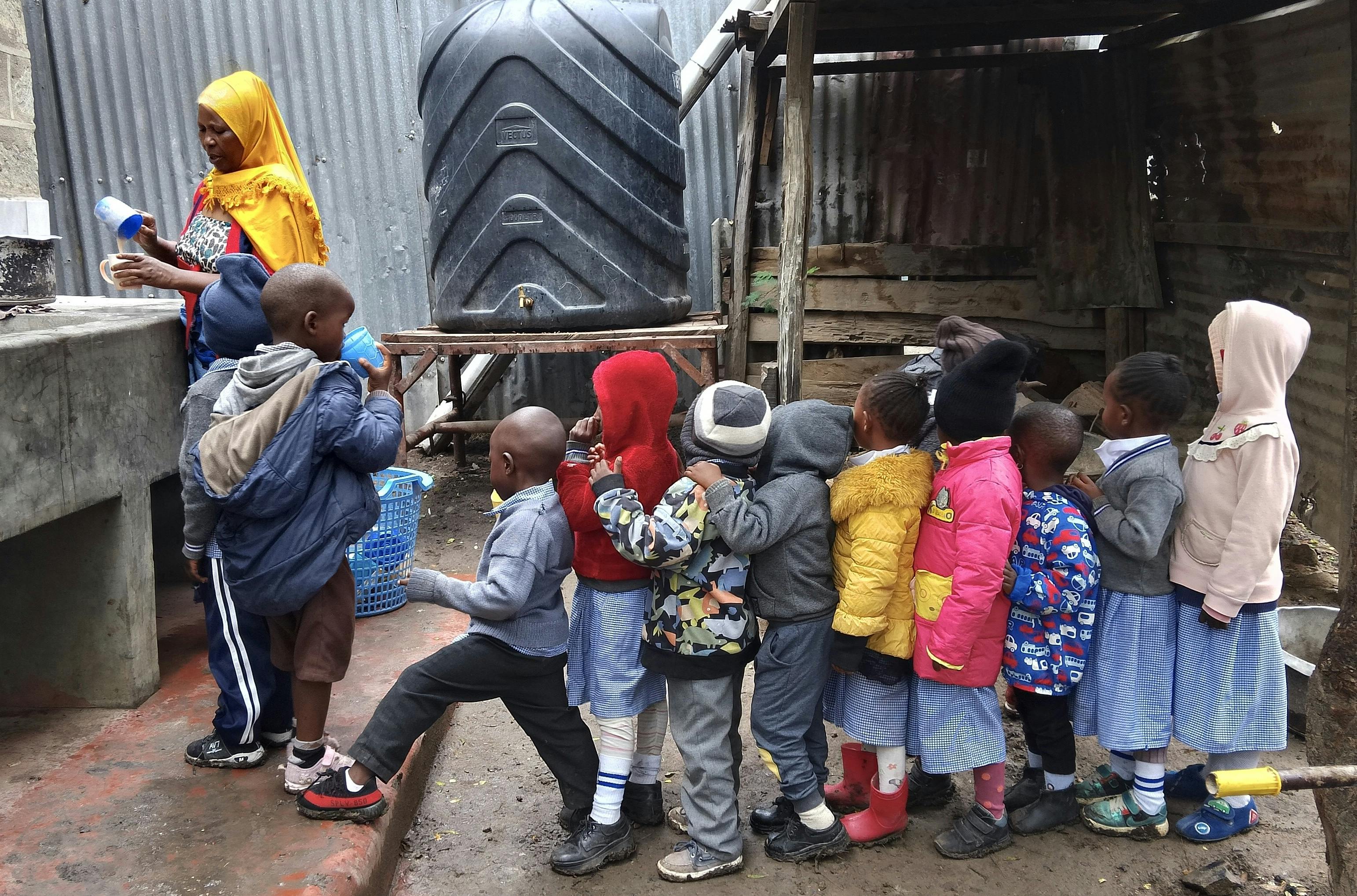 小雨のなか、おやつのウジ(おかゆ)をもらうために並ぶ幼児たち。