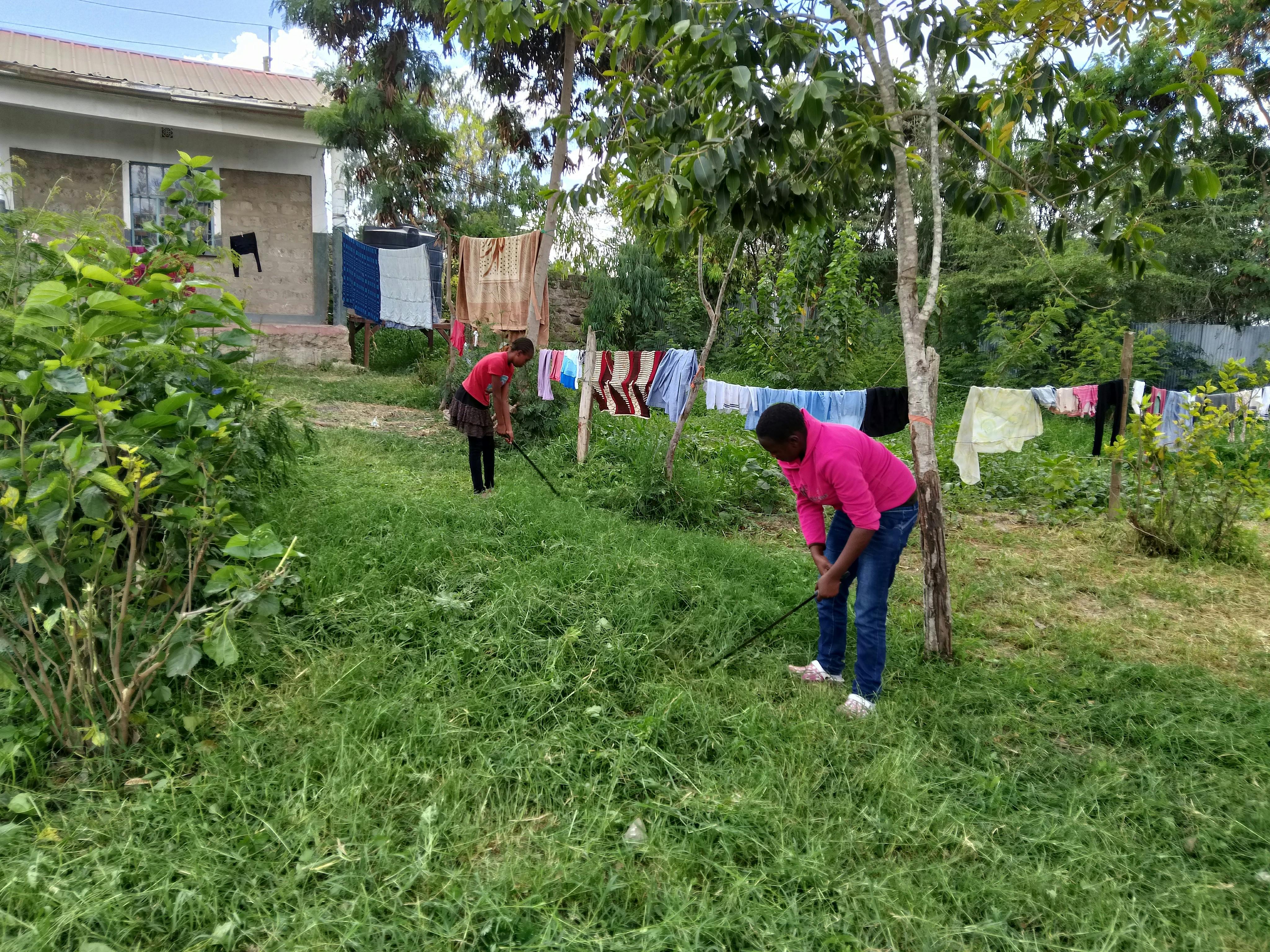 このところ雨は降らなくなり、施設の子ども部屋のまわりの草刈りをする子どもたち。(西洋式の草刈りカマを使っている)