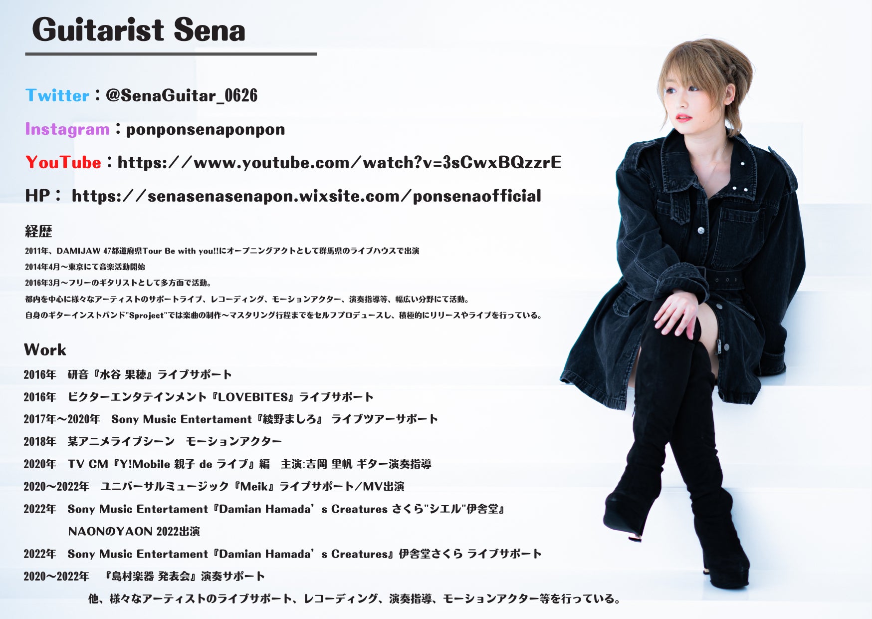 プロギタリストとして様々なアーティストさんのバックで演奏やレコーディング、映像出演や演奏指導などの活動をさせて頂いております、Senaと申します。