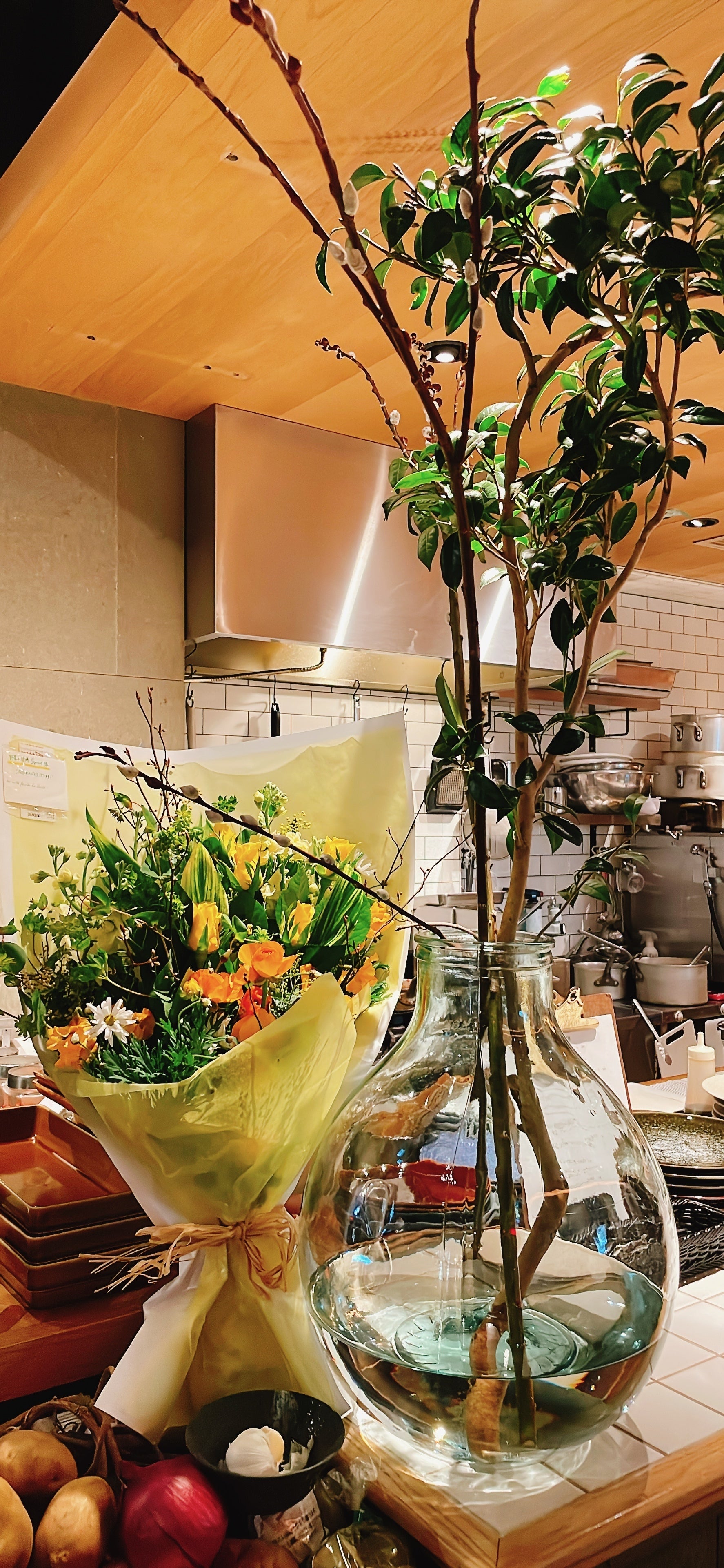 2023/02/05 18:30お客様よりお花を頂戴いたしました!そして、遥々スペインより、100%リサイクルガラスの花瓶が届きました。まぁ、リサイクルではあるものの、大きなガラス製品を運搬ということで、ダンボールやエアの入ったクッション性のビニールとか発泡スチロールとか…ゴミが多くてなんだか複雑な気持ちになりましたが…。。生けたのは、Sproutで人気の椿茶にあやかり椿の木と日持ちするネコヤナギを飾りました。自宅近所の優しいおばちゃんが1人で切り盛りしているお花屋さんで仕入れて、長い枝葉を自転車で運びました。途中246でイカついお兄さんが乗る車に枝がぶつかり、怒号を浴びながら懸命に運びました…笑そして!オープン記念に、ご来店のお客様へ国分寺東花園芸さんのお花をプレゼントしております!看板と入口建具は、納期の関係でもう少し時間がかかりそうです。。。さて、皆さまのおかげさまにて目標を達成させて頂きましたクラファンですが、ネクストゴールへ向けてラストスパートの時期となりました。2/14までの公開となりますので、引き続き是非ともシェアのほどよろしくお願いいたします!それではまた進捗をお知らせさせて頂きます!大越 もっと見る