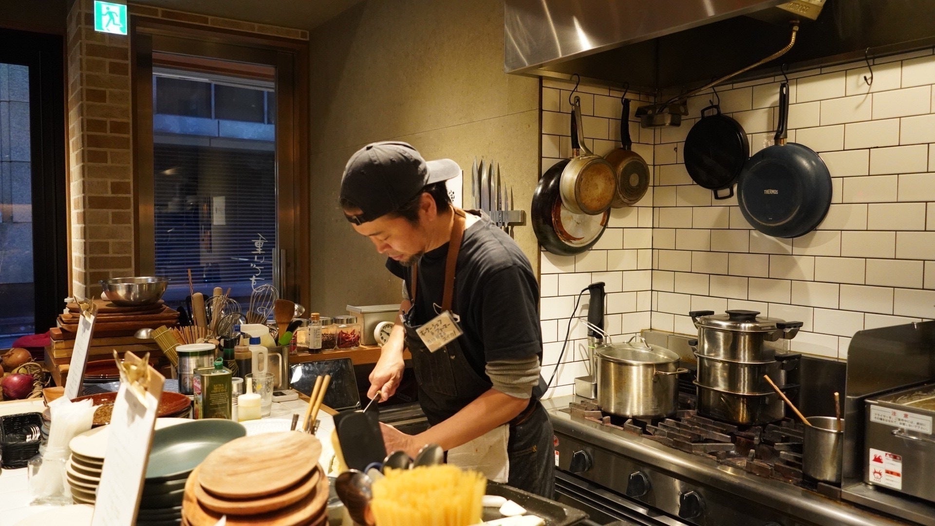 「Sprout」のカウンターキッチンで腕を振るう大越は2019年に外食企業を退社し会社を設立。しかし起業後半年も経たずにコロナ禍が襲いました。妻子もあるなかでの大ピンチ。にっちもさっちもいかない状況で大越の心を慰めたのが東京の農業でした。
