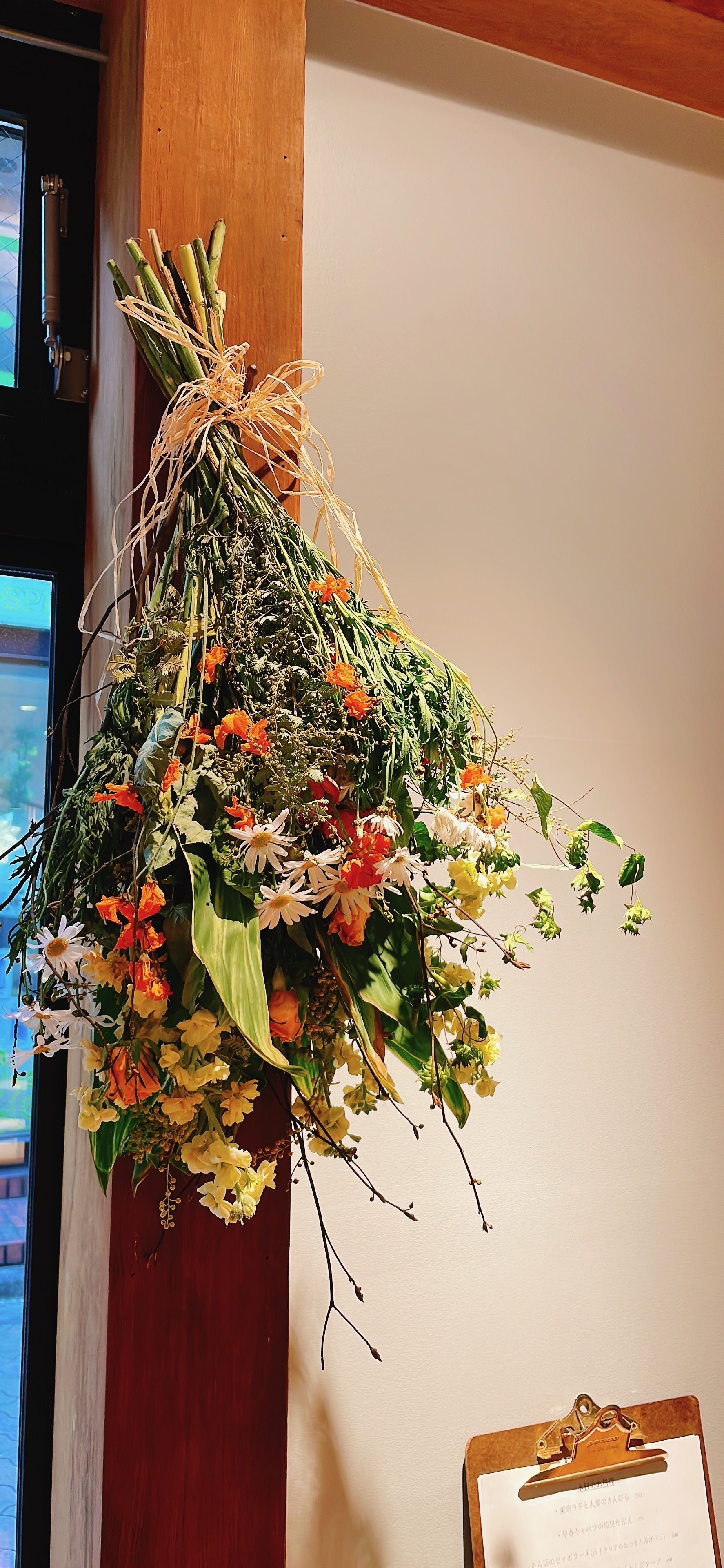 この写真はご支援者の皆様から頂いた開店お祝いのお花を、ひっくり返して乾燥させたら思いのほか綺麗にドライフラワーが出来たので、店内に飾っております!の写真です。