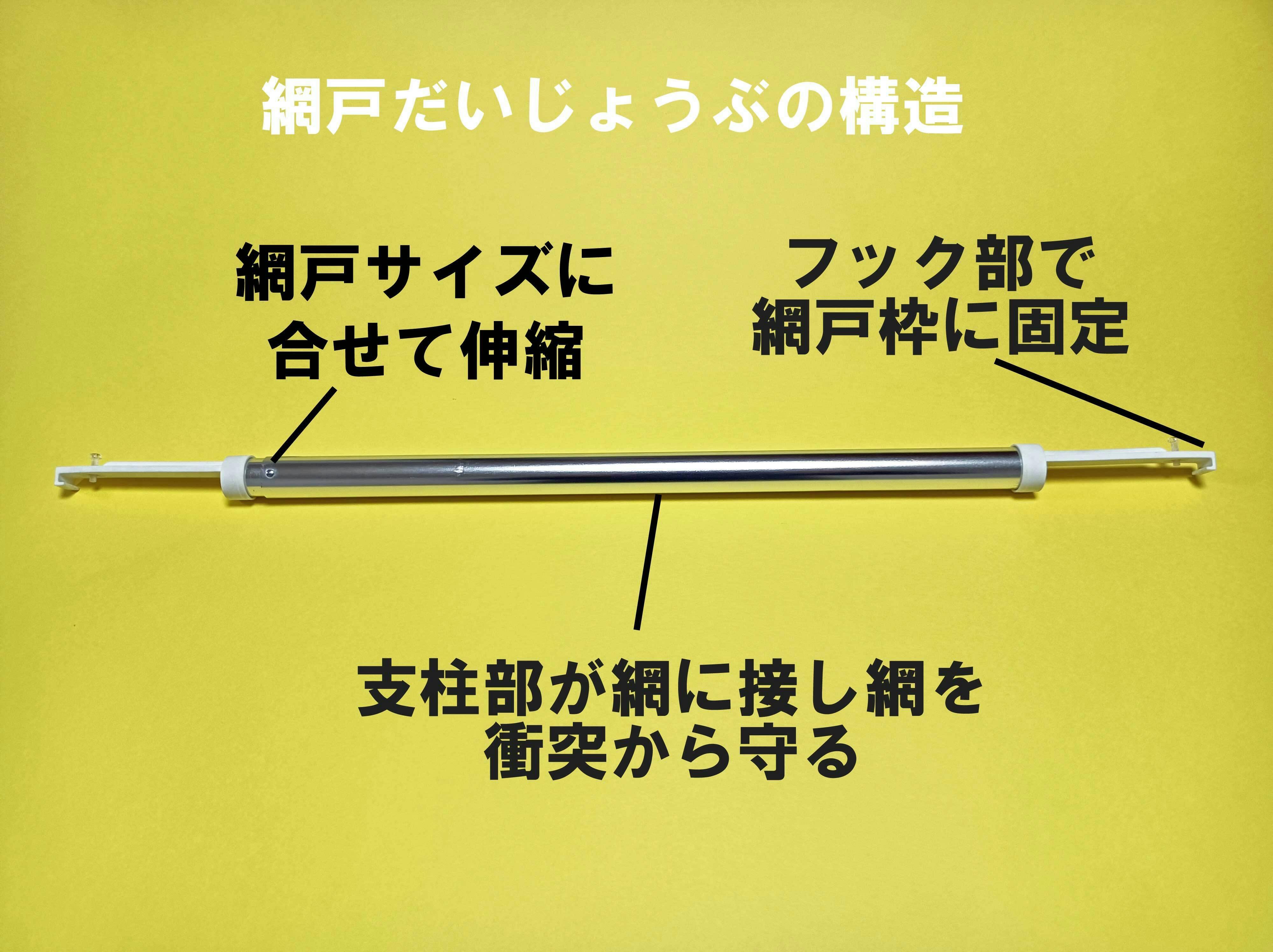 【網戸だいじょうぶ】を設置すると、網戸に子供や犬など愛玩動物などが不意に寄りかかっても、棒状の【網戸だいじょうぶ】が網を支え、網が衝撃を受けた際に十分耐えうる構造になっており、網の破損の度合いを軽減することができます。