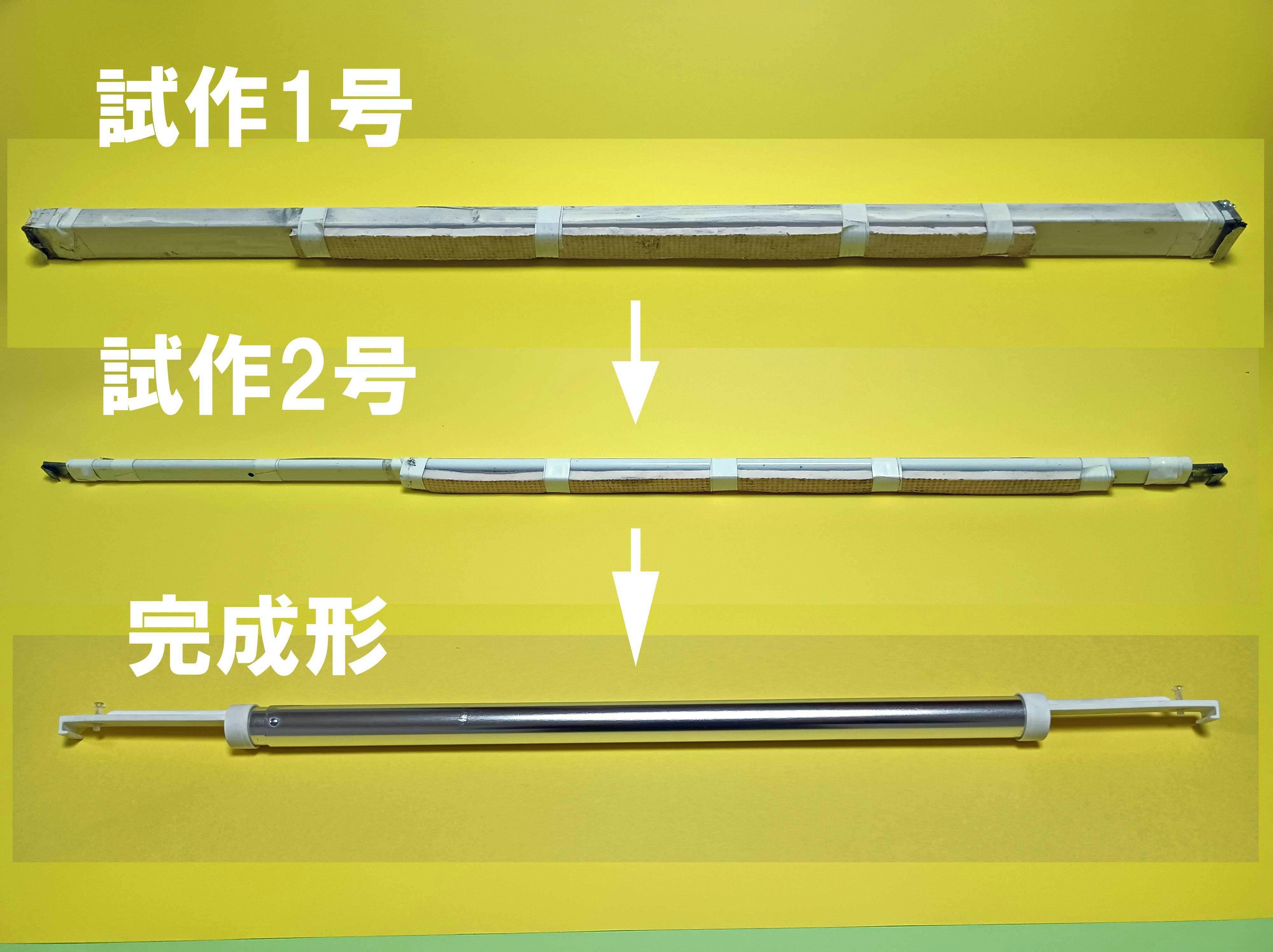 木材に色を塗り、両端にアルミで作ったフックを取り付け、中央部にジョイントマットを貼り付けてまずは試作品を作ってみました(試作1号)。試作品を使用してみると凄く効果があり、さらに商品化に向けて試作品の改良を始めました。試作品2号はカーテンレールを加工して作りました(試作2号)。