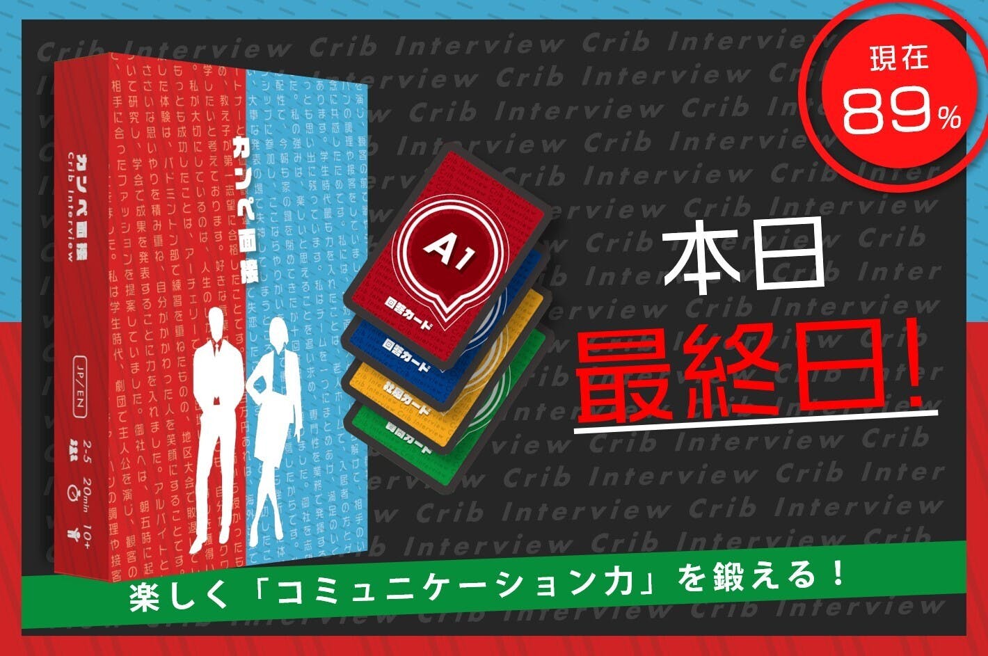 「カンペ面接」は、手札の組だけで面接の受け答えをするボードゲームです。伝えるを、遊びながら、効果的に鍛えることができます。500円から出資いただけ、3,000円でゲーム本体を1セット購入いただけます。