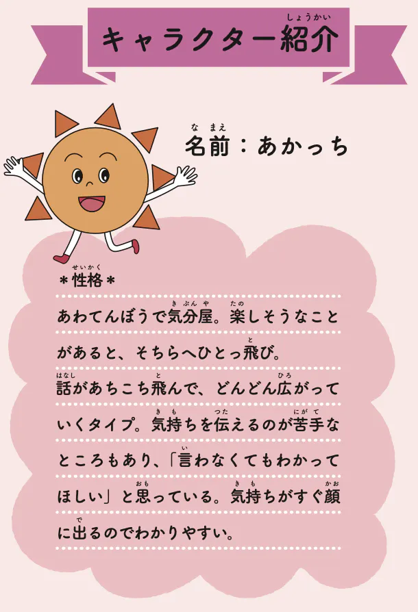 この3つの個性をキャラクターにし、協力し合ったり、ときにはぶつかったりしながら、みんな違うことを認め合うすばらしさを伝える絵本です。