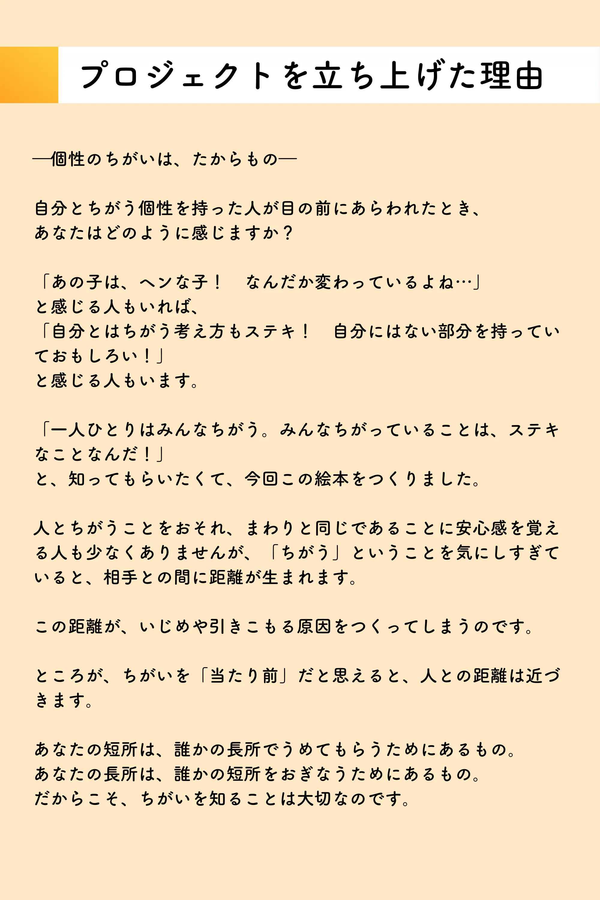 個性は一人ひとり違って、だからこそすばらしいということを子どもたちに伝えたい。