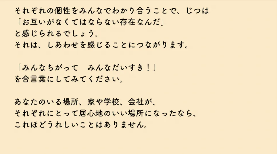 それぞれの「個性」「特性」の違いを認め合うことの大切さを伝えたいと思っています。