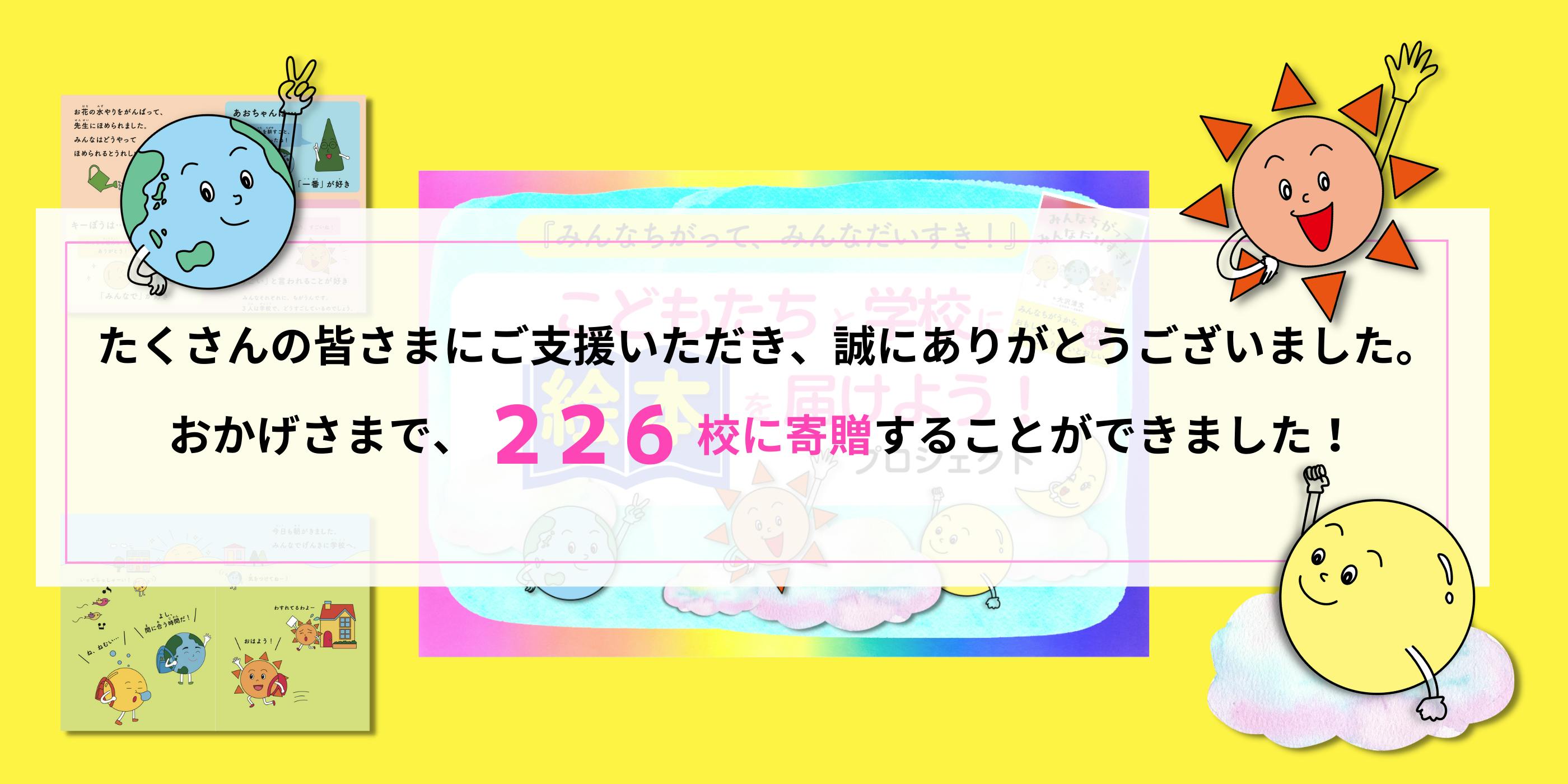 2023/04/12 08:30「こどもたちと学校に絵本を届けよう! プロジェクト」プロジェクトオーナーの大沢清文です。個性は一人ひとり違って、だからこそすばらしいということを子どもたちに伝えたい、という思いで始めたこのプロジェクトに336人の支援者とキレイデザイン協会のマスターインストラクターの方々の協力のおかげで226校へ絵本を寄贈することができました。皆さんのご支援でこの絵本に出会った子どもたちが自分とは違う個性を楽しみながら理解して、自分以外の人と関わり合って生きていくことの豊かさを感じ、明るい未来を思い描き大人になることが楽しみになるよう心から願っています。最後になりますが皆様から頂戴いたしました温かいご支援に心より御礼申し上げます。ありがとうございました。 もっと見る