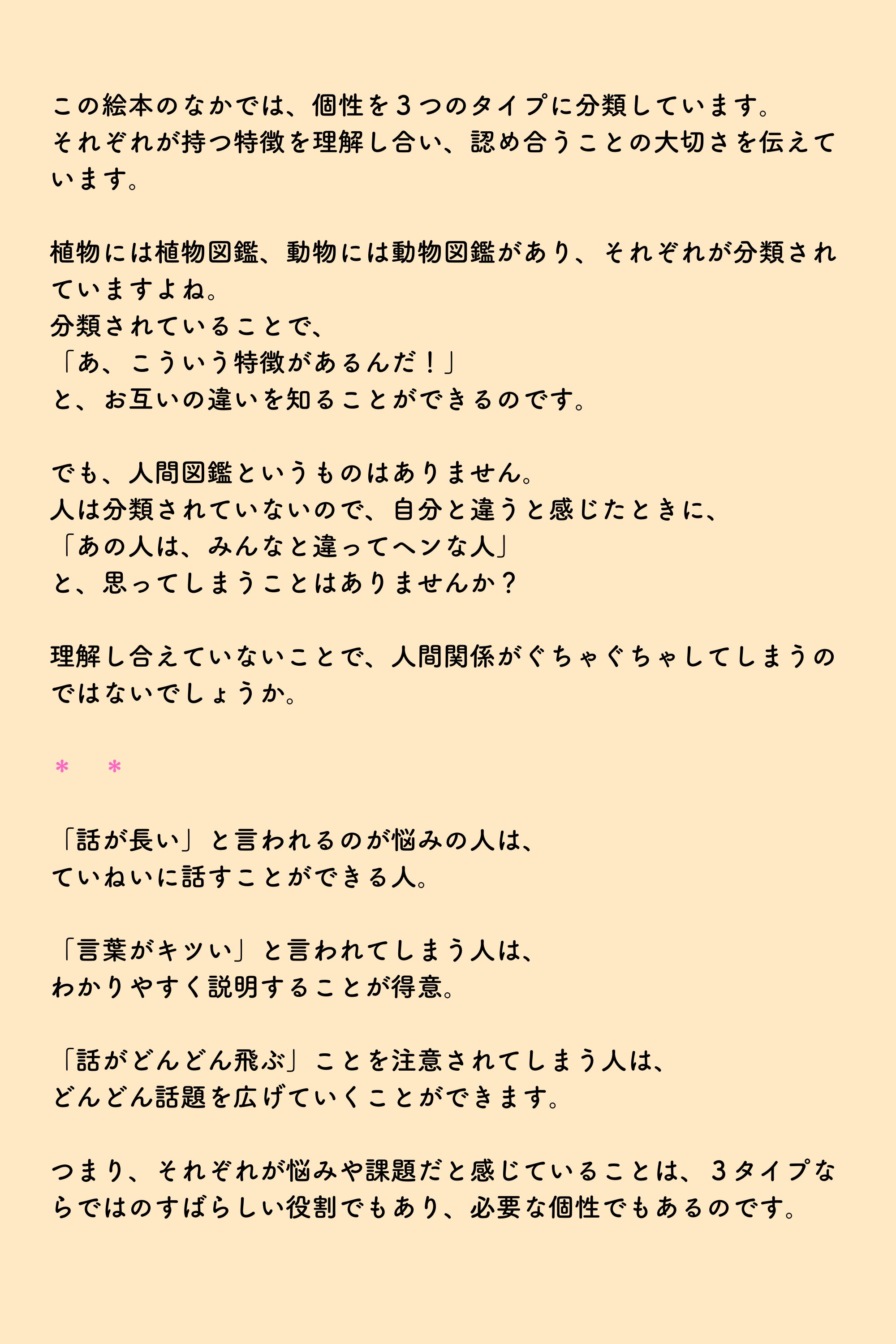 この3つの個性をキャラクターにし、協力し合ったり、ときにはぶつかったりしながら、みんな違うことを認め合うすばらしさを伝える絵本です。