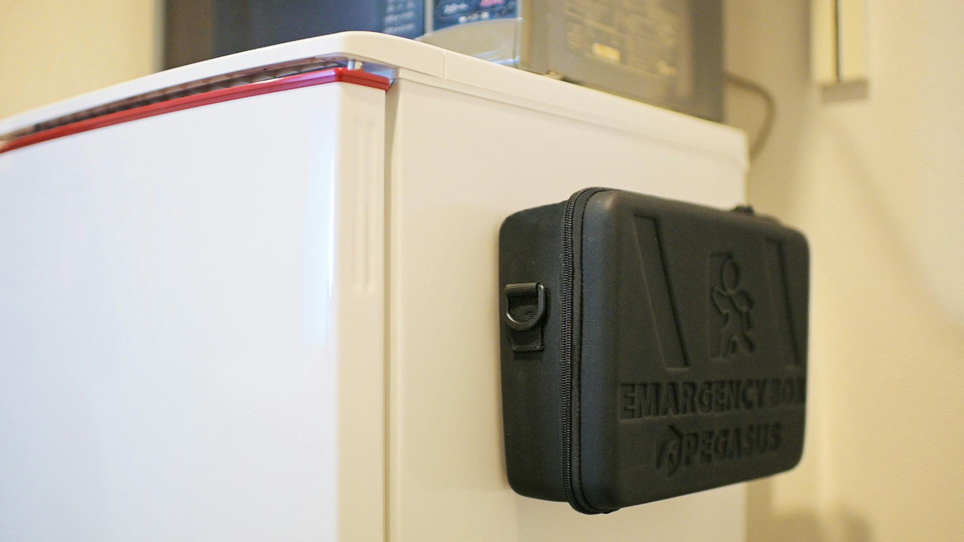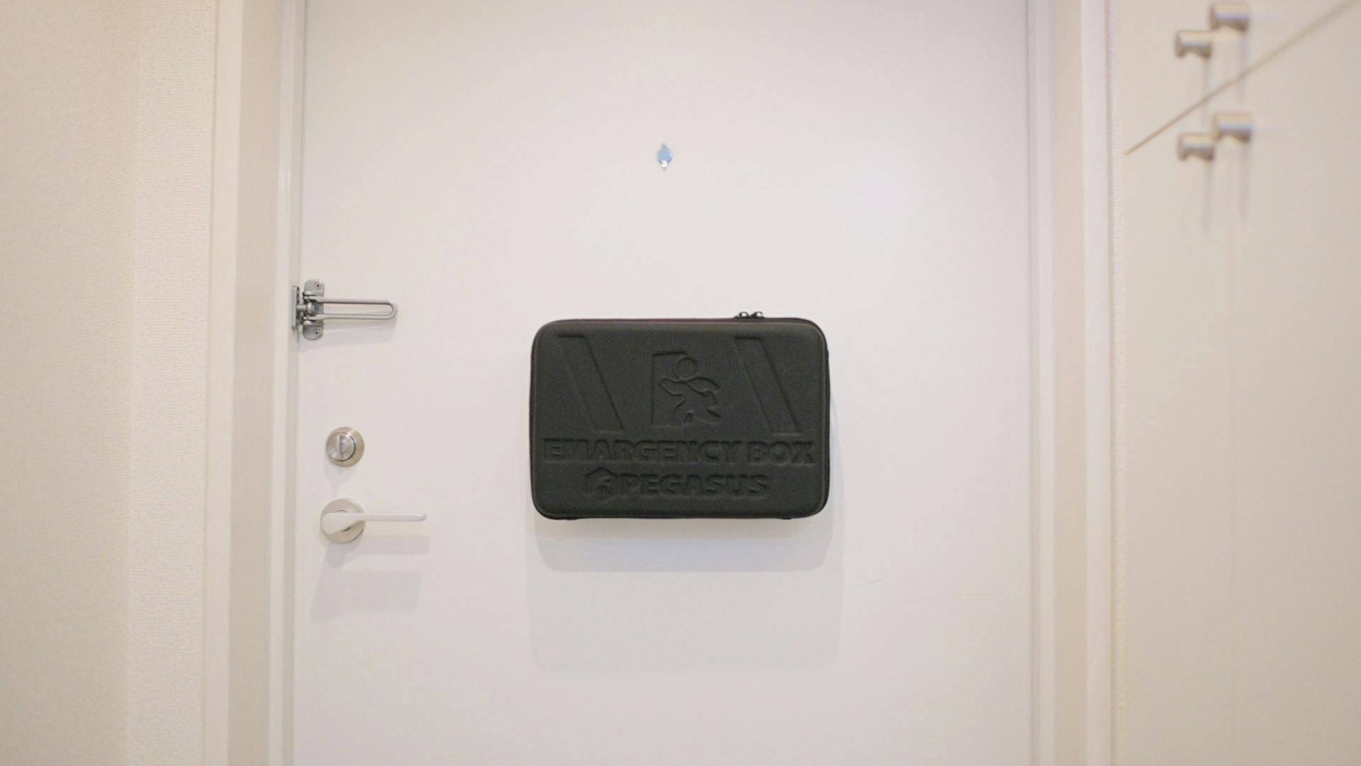 もしもの場合は、玄関に貼ってあるBOXを剥がし、肩にかけて避難することができるのです。