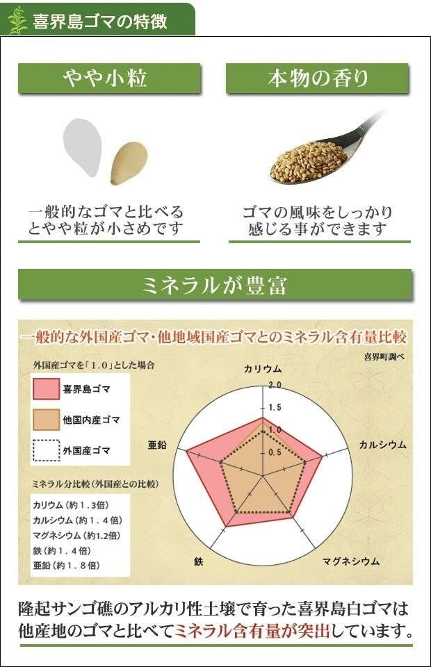隆起サンゴ礁のアルカリ性土壌で育った喜界島産の白ごまは他産地のごまと比べて、栄養価が高く、ミネラルが多く含まれています。また「セサミン」というゴマリグナン類の成分が、喜界島産白ごまには多く含まれています。(喜界町役場調べ)