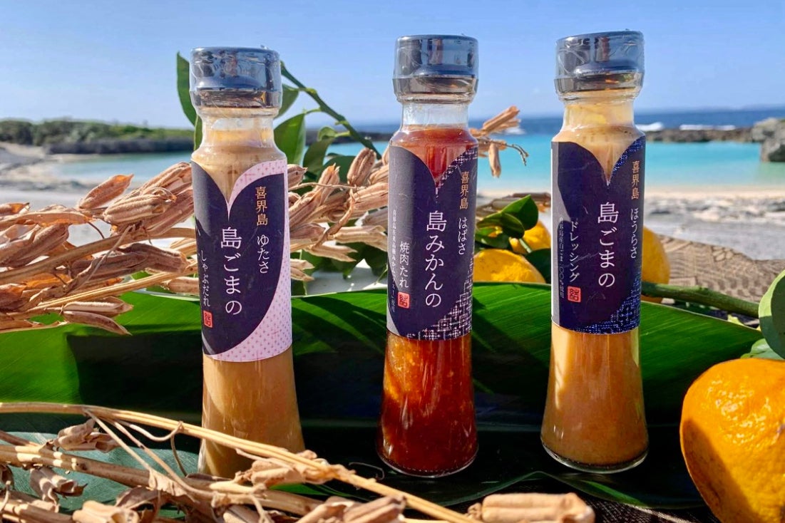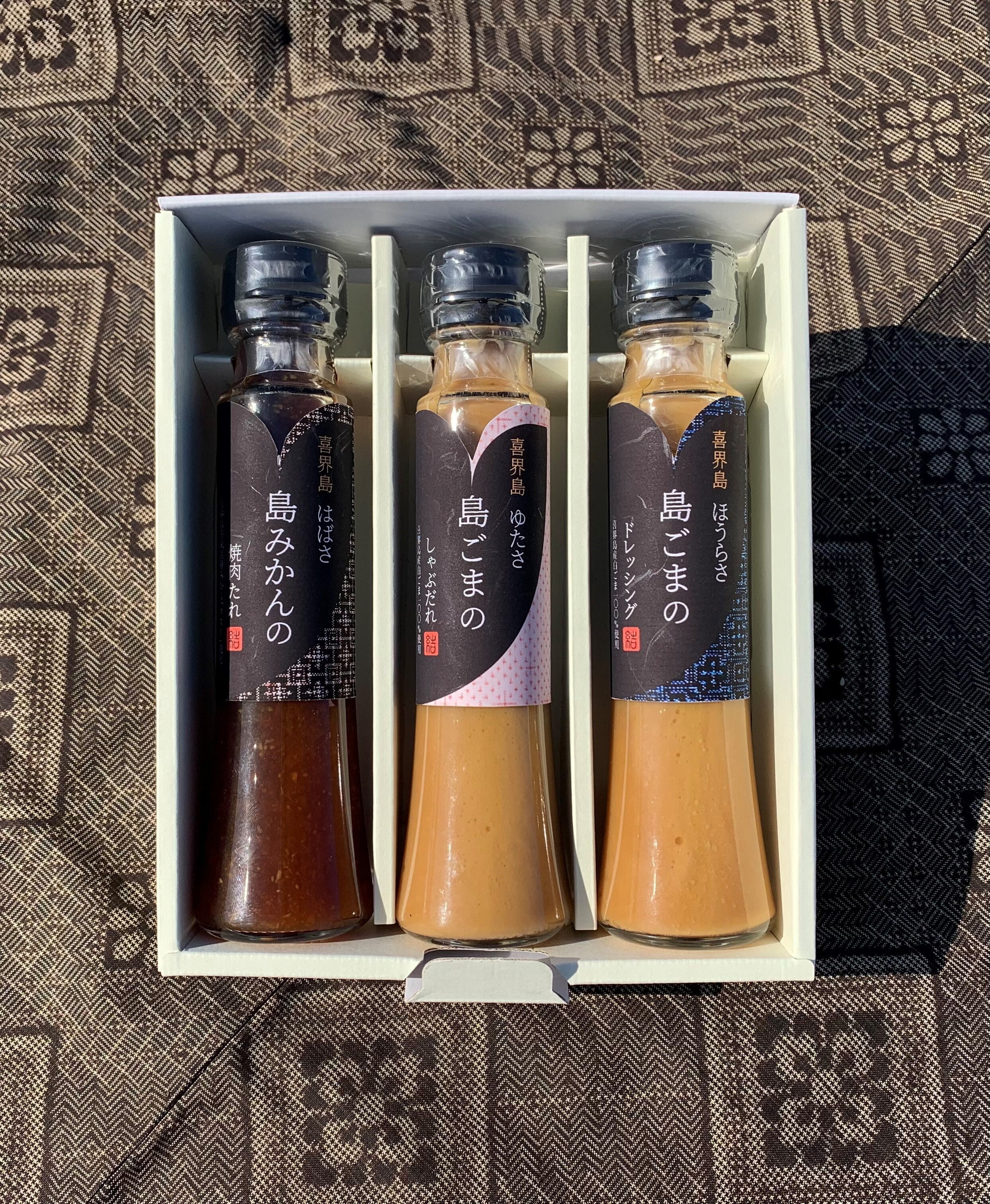 デザインに込められた想い、背景にある喜界島の歴史など、伝えたい物語を『ゆたさ島ごまのしゃぶだれ』『ほうらさ島ごまのドレッシング』『はばさ島みかんの焼肉たれ』の3本セットに添えてお届けします。