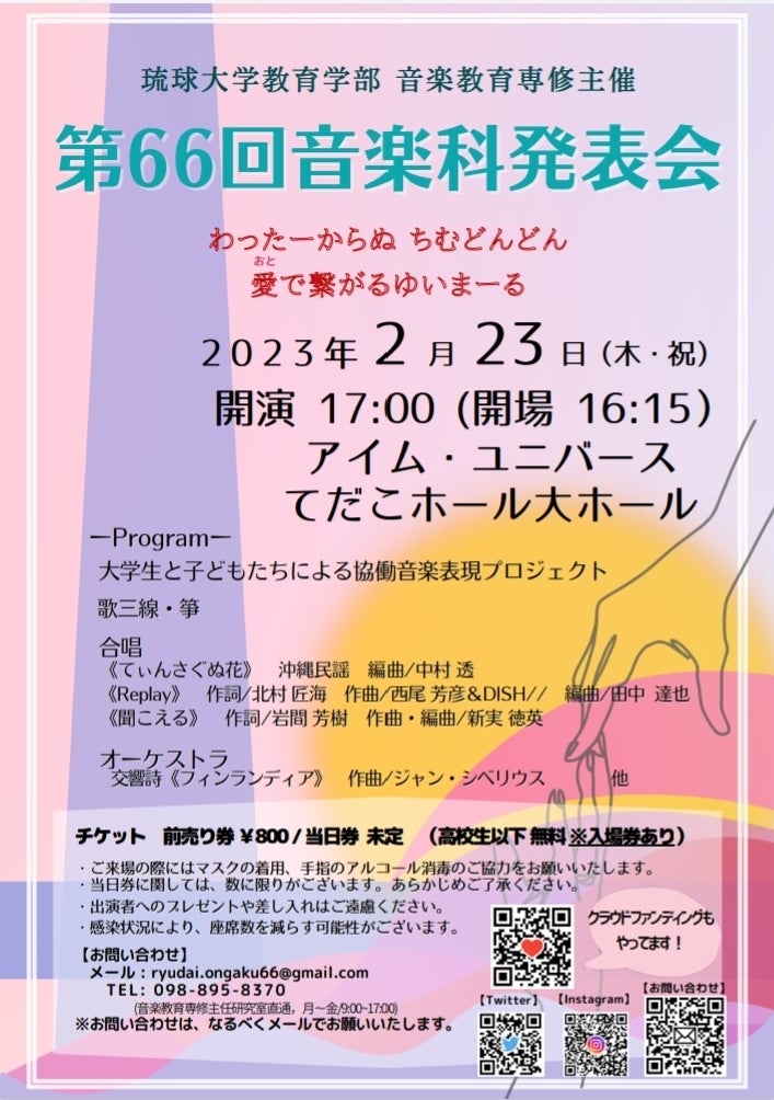 私たちは、2023年2月23日(木・祝)にアイム・ユニバースてだこホール・大ホール(浦添市)にて第66回音楽科発表会を開催予定です。