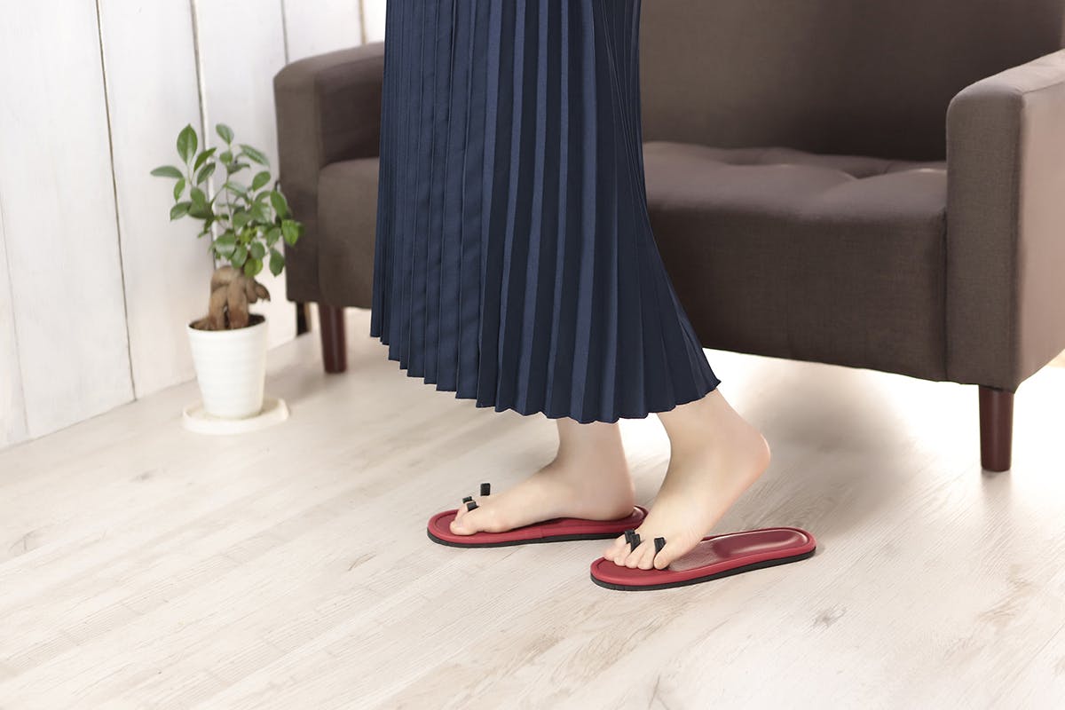 鼻緒のないスリッパは、奥様方やお年を召した方々の運動不足を少しでも補っていただきたい、と開発されました。歩こうとした時点で、五本の足指に力が入り曲がりはじめます。そして、台部を持ち上げようとした時、土踏まずに力が入ります。この形が地面を噛んで歩く、足の指と足の裏の形であります。歩行を始めると、まず片方の足の裏が緊張して第一趾と第二趾が曲がり、つられて残りの指が曲がりはじめます。さらに、一歩踏み出すときの足の裏の緊張はかなり激しいものとなります。今迄使ってこなかった筋肉が、収縮し圧迫されていることを感じることができます。この時点での別の片方の足の裏は緩んでいます。これを繰り返す足の裏のストレッチは過酷を極めます。このストレッチは、若いOLの方々や奥様方、さらにお年を召された方々に必要なものであると信じております。若いOLの方々の運動不足の解消にも繋がります。さらに、使用したOLの方々のなかでも、「足の指が地面を噛んでいる」との感覚を得られる方が多数おられます。