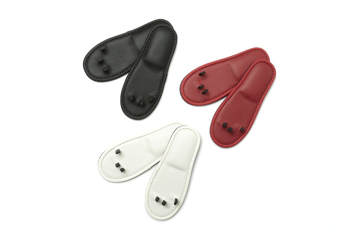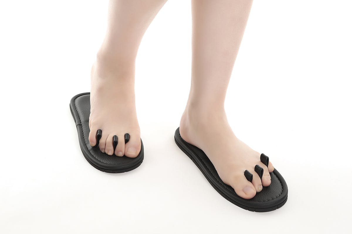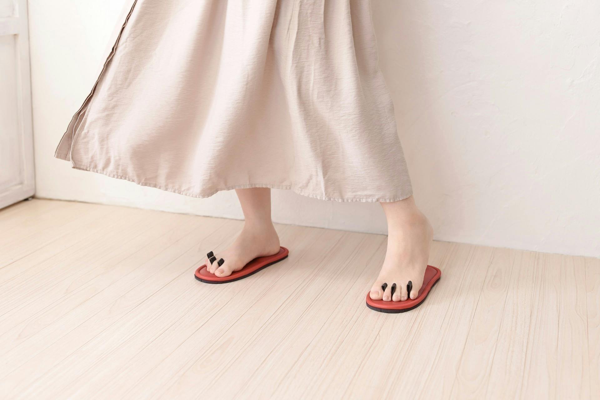 足指スリッパには鼻緒がありません。代わりに下駄の前坪をポールとして3本、スリッパの台部に設けてあります。足の指の股でそれらのポールを挟み、台部を持ち上げなければなりません。歩いても、台部が足の裏からズレることはありません。第一趾と第二趾で第1のポールを、第二趾と第三趾で第2のポールを、第四趾と第五趾で第3のポールをそれぞれの股が挟み込み、台部を持ち上げます。
