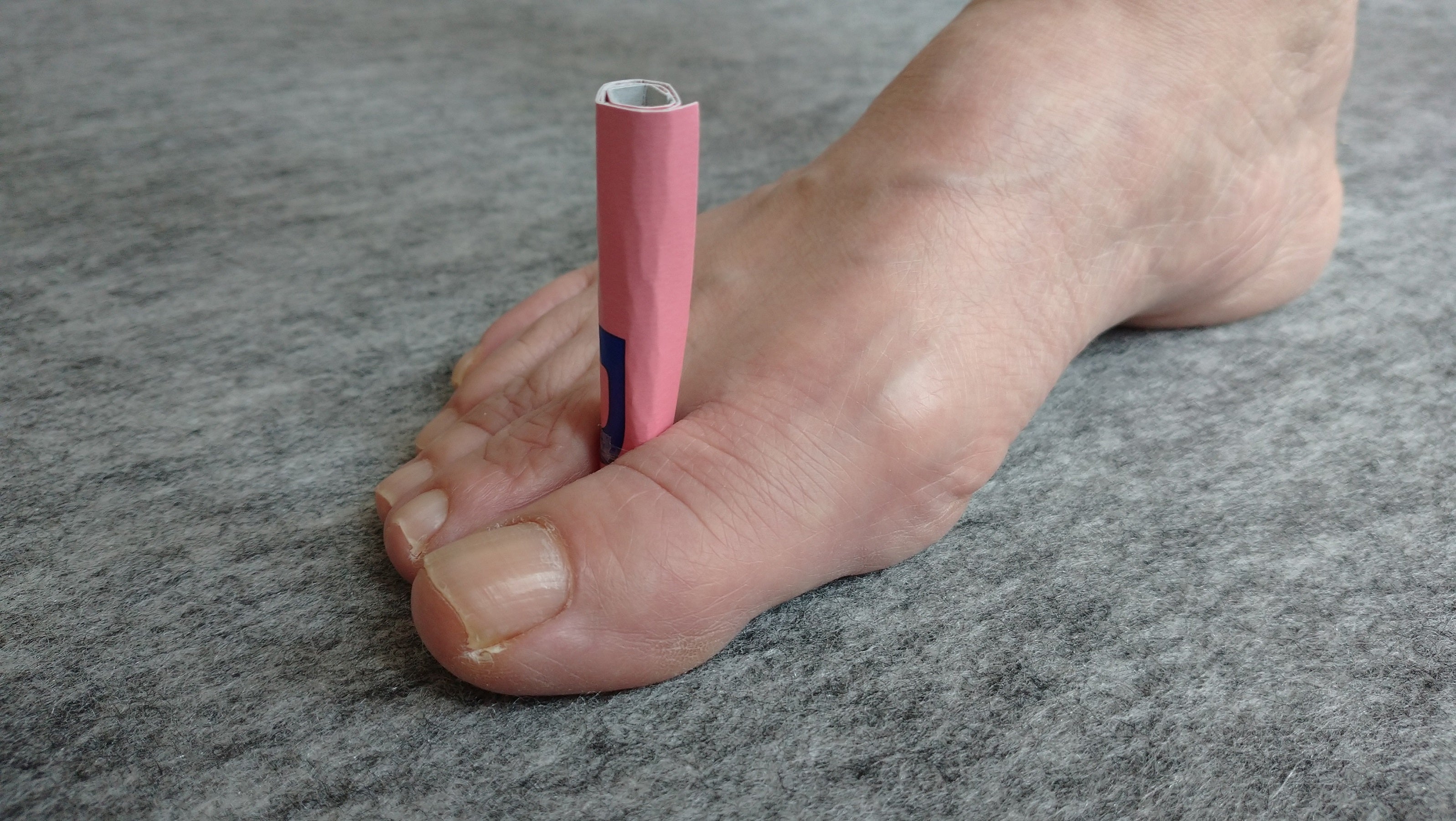 一度試してみてください。長さ8センチメートル(重みが無い為)位の厚紙もしくは布切れを、下駄の前坪の太さ(細いストローの太さ)になるくらいに巻いて、足指の第一趾と第二趾の股に入れて、厚紙もしくは布切れが抜け落ちないように、歩いてみてください。今までにない足指の動きや土踏まずの動きを体感できます。スリッパの台部が無く重量を感じることができないために、厚紙を8センチメートルの長さにして体感して欲しいのです。厚紙や布切れがなければ、足指の股が傷つかないものであれば良いので試してみてください。きっと、鼻緒の無いスリッパの良さを分かって頂けると自信を持っています。
