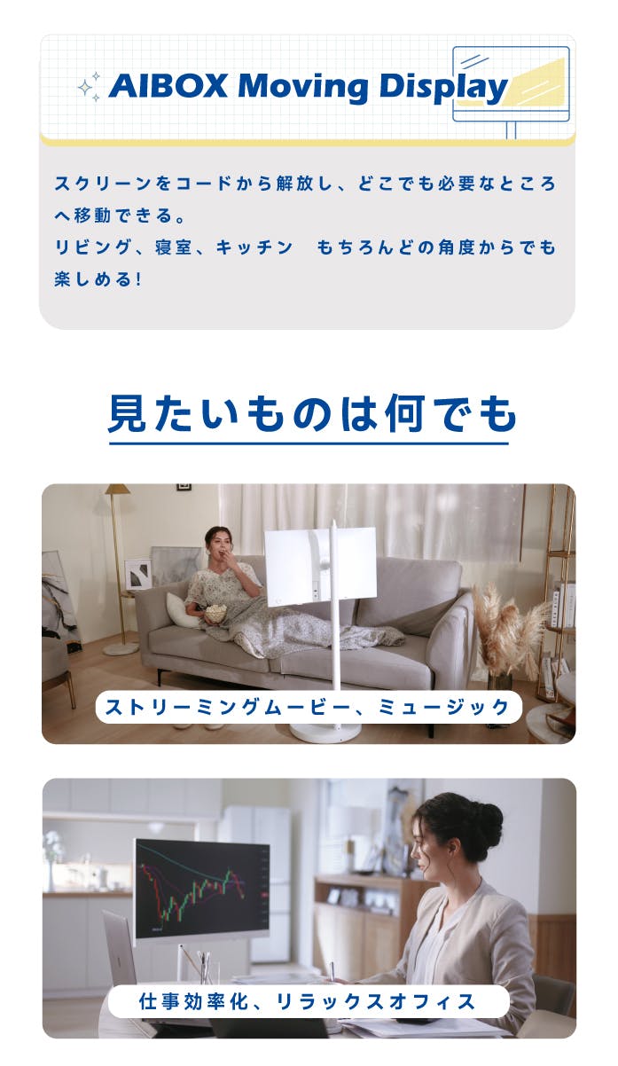 2022/11/30 15:36AIBOX Moving Display #初日で目標達成皆さんの熱烈な支持に感謝して、私たちは発売後すぐに目標を達成させましょう!移動式ディスプレイ !!6つの特色 !!▌#寝ながらドラマ鑑賞の夢を実現 ▌ディスプレイは上下、左右、前後どれも調節可能。ベッドの上でも快適にドラマ鑑賞▌#空間に囚われない ▌5つのタイヤを台座に内蔵。家中どんなところも自由に移動でき,コンセントいらずで視聴可能!▌ #各ストリーミングメディアも視聴可能 ▌Youtube、Netflix、Disney+、HBO GO など!▌ #スマートフォン・パソコンからストリーミング ▌Chromecast のストリーミング機能を使えば、スマートフォンやパソコンからディスプレイへ直接ストリーミングが可能▌ #HDMIケーブル対応 ▌各家庭用ゲーム機 Switch、PS5、XBox に対応▌ #業界最大のバッテリー持続時間 ▌充電後のコードレス使用で、連続5時間の視聴が可能※ すべての製品は #1年間のアフターセールス保証サービスをお楽しみいただけます もっと見る