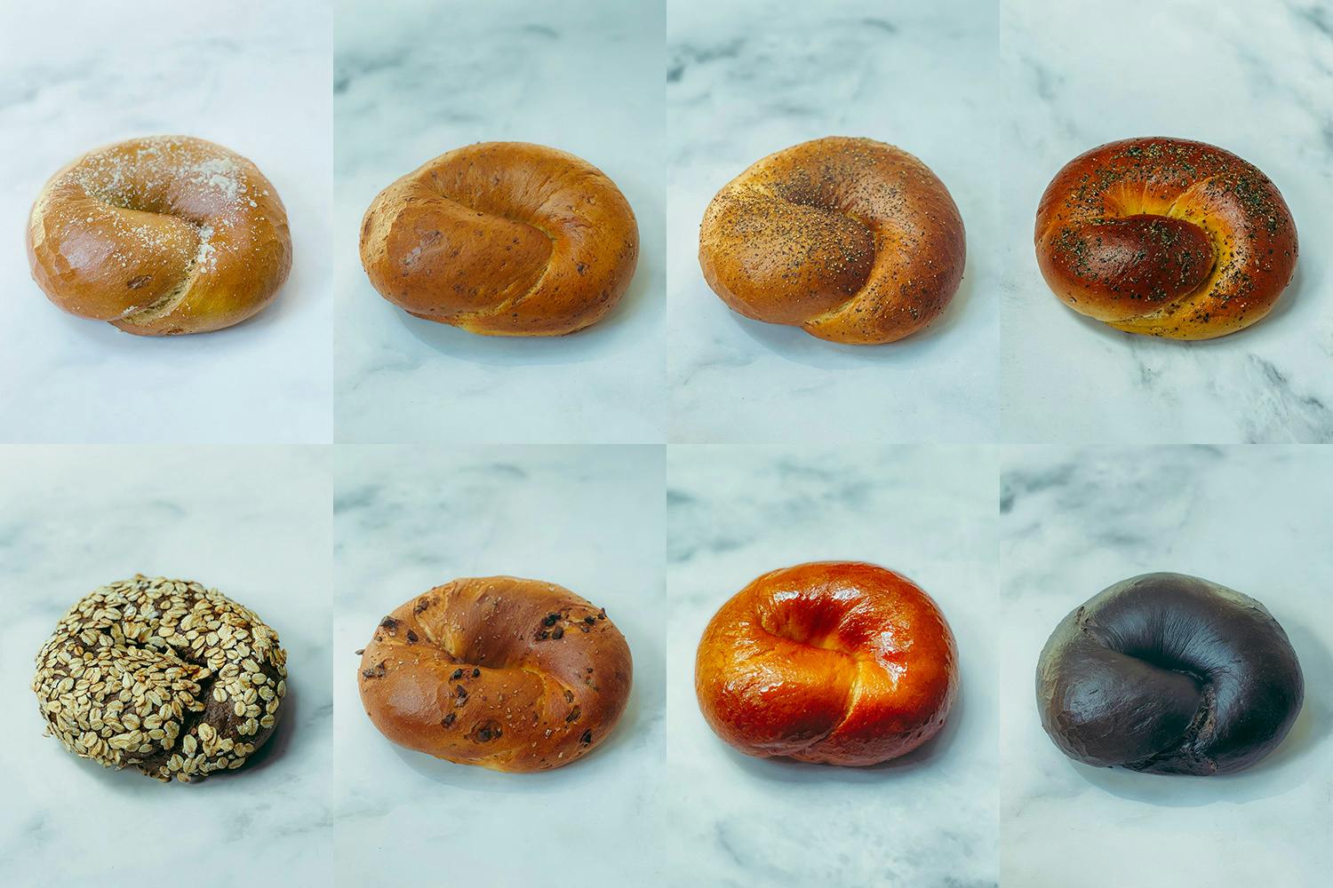 プレーン、全粒粉、ゴマ、ライ麦、エブリシング、マンハッタン、エルビス、アズーリ、プンパーニッケル、サウスインディアン