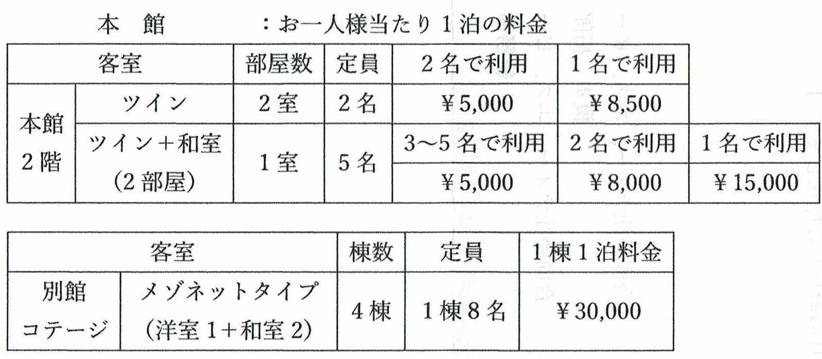 宿泊料金 :基本料金 大人一人1泊 ¥5,000 (小学生以下¥1,000割引)
