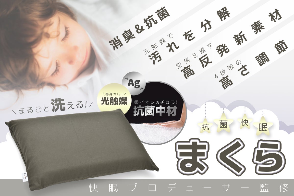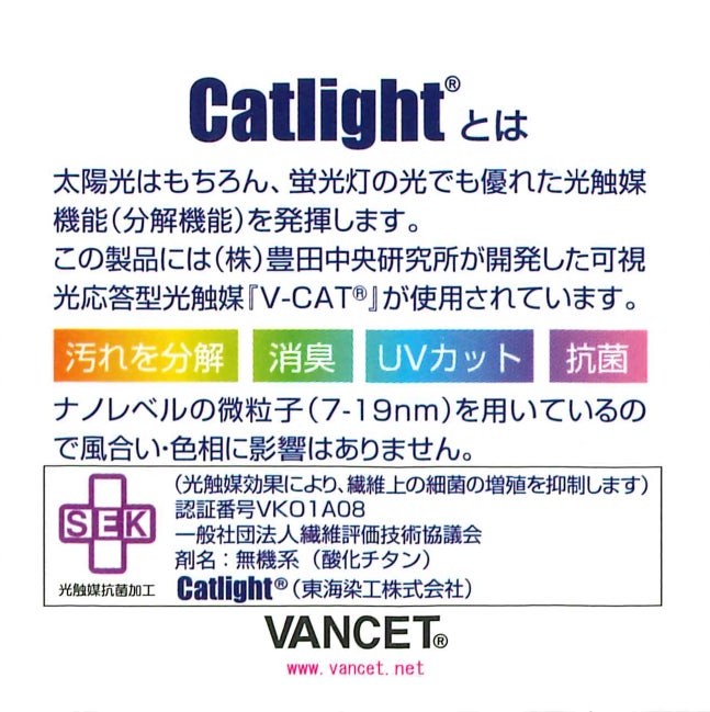 付属の枕カバーには、(株)豊田中央研究所が開発した可視光対応型光触媒「V-CAT®」を使用。太陽光だけでなく、蛍光灯の光でも、優れた光触媒機能(分解機能)を発揮!汚れの分解・消臭・UVカット・抗菌などの効果が期待できます。