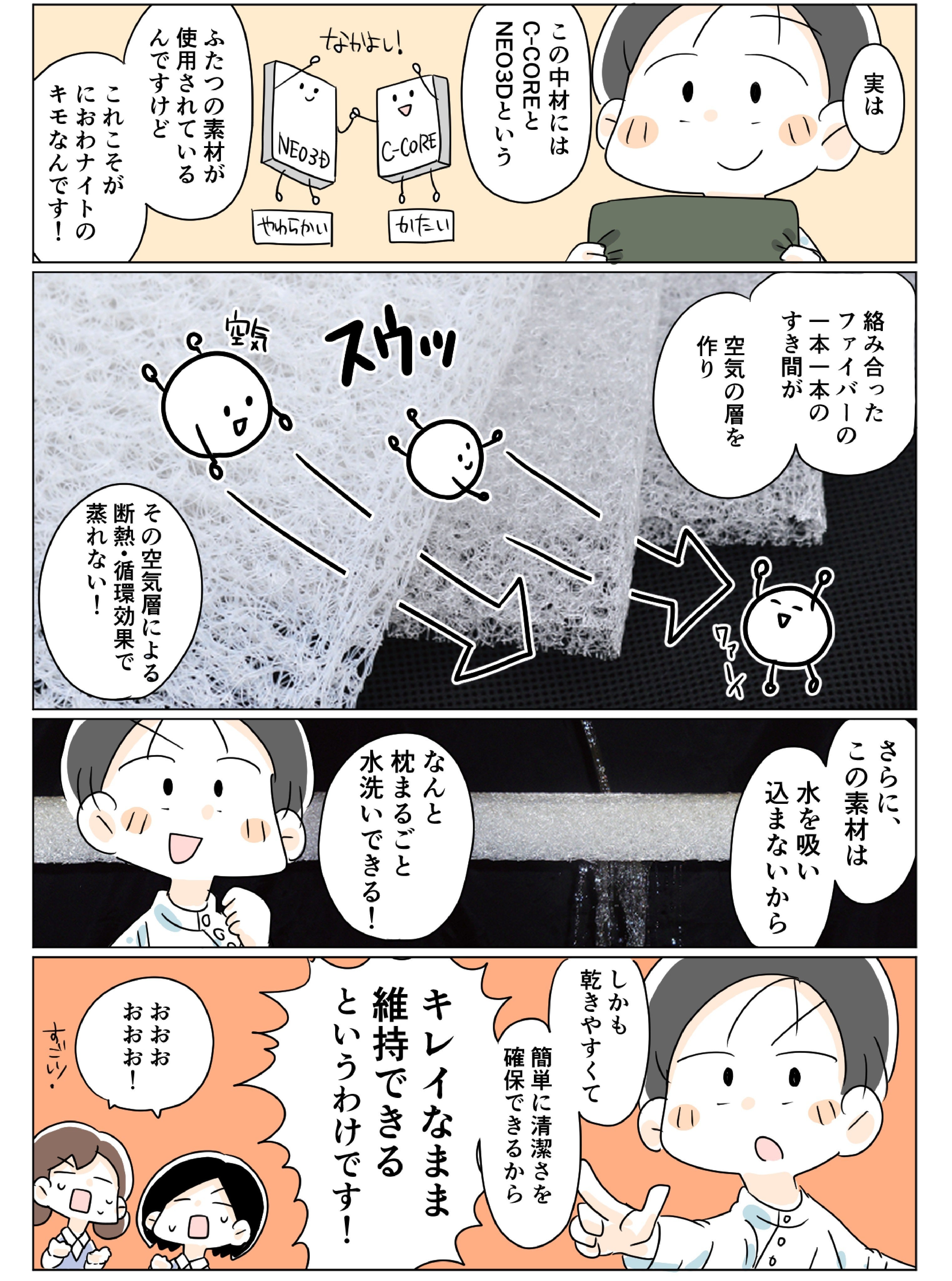 ポリエチレン素材を原料とした立体網状構造の中材は90%以上が空気の隙間となっています。いつでも空気が循環し、湿気などが溜まることがないため、夏は涼く、冬は暖かな状態となり、ダニの発生などを抑制します。