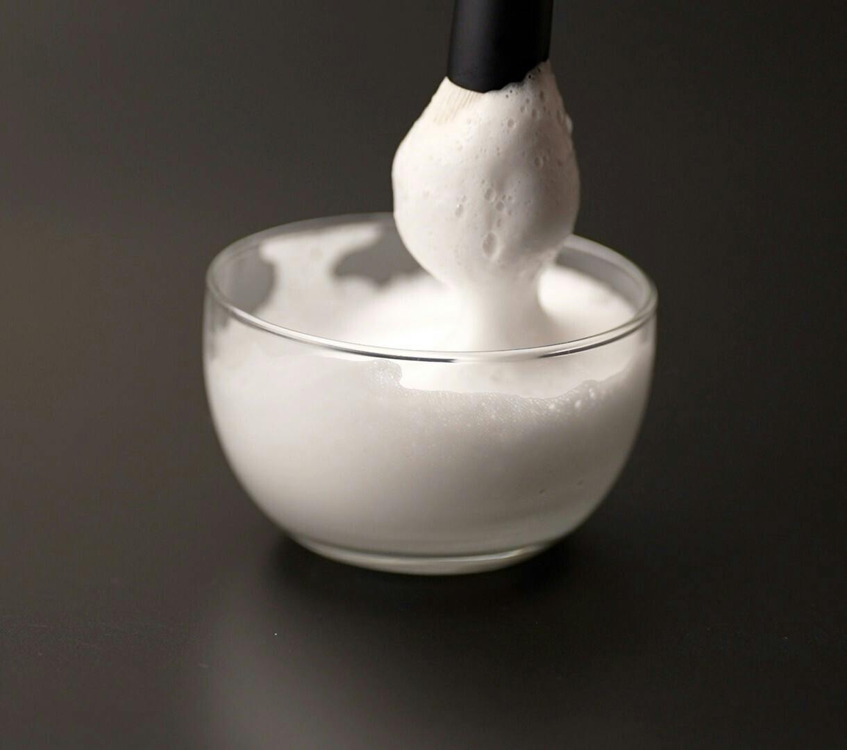①容器に水または、ぬるま湯と洗顔料を入れ、洗顔ブラシで泡立てます。