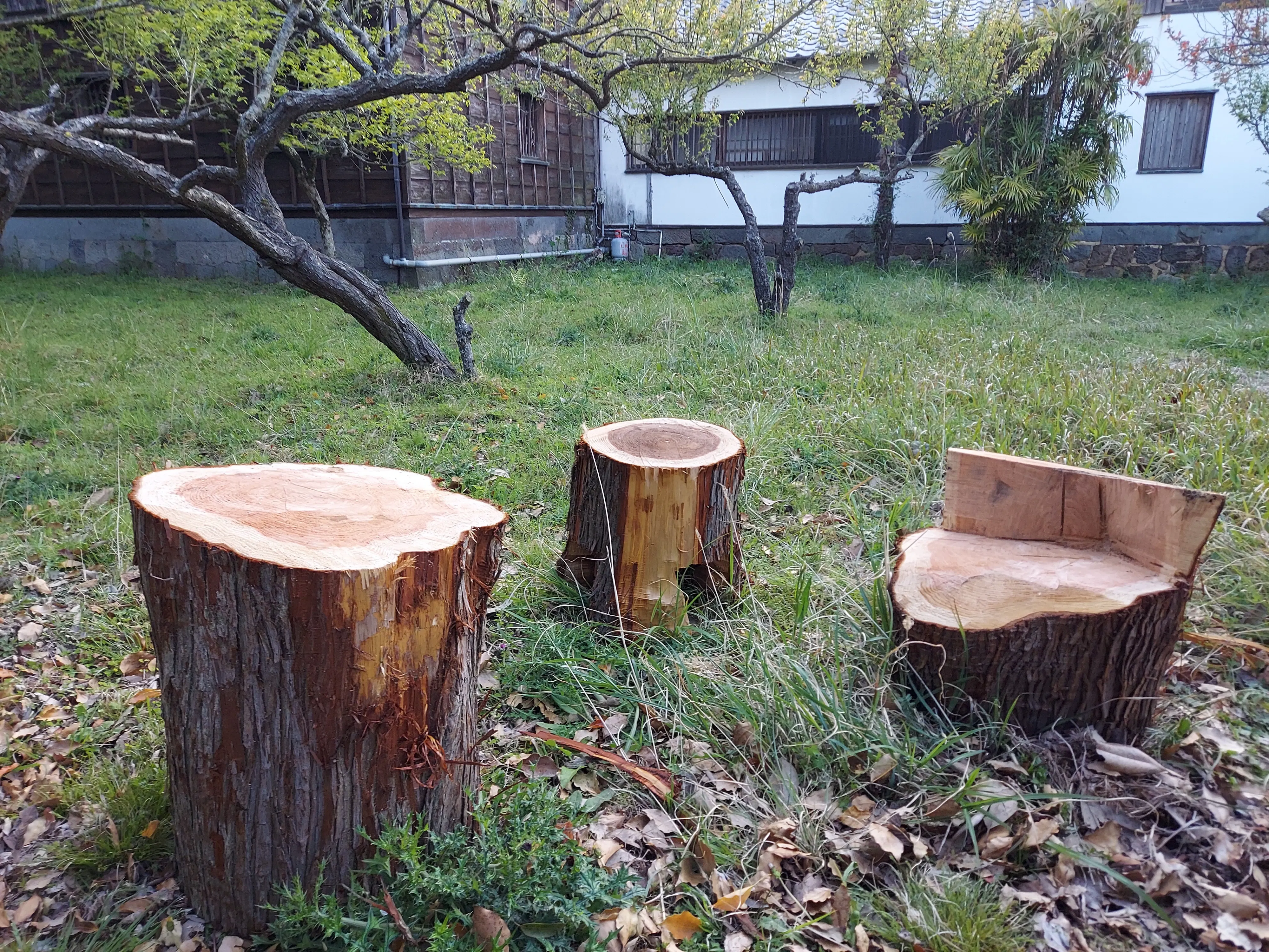 今日は地域のUさんが大きな丸太をチェーンソーで細工して椅子、ソファ?、テーブルを作ってきてくださいました!!