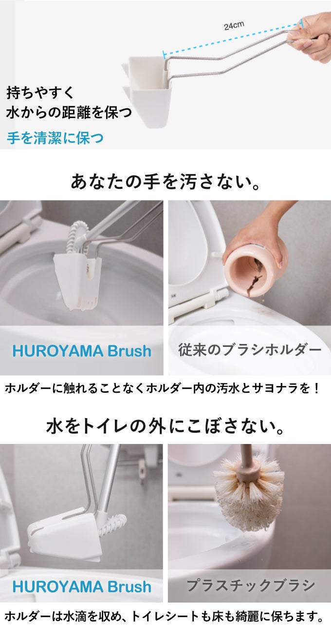 HUROYAMA Brushは従来のトイレブラシもより永く使い続けられるようにつくられました。丈夫なだけでなく、使用後も清潔さを保ちます。衛生面を損なうことなく、不必要な使い捨てやダメになったブラシの廃棄を減らすこともできるから、お財布にも非常に優しい。良いことづくめ! すぐに捨てざるを得ないブラシにお金は払う必要はもうありません!