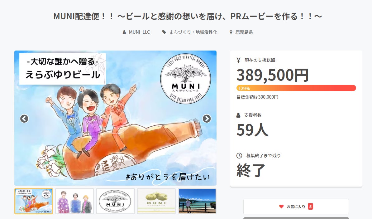 59名の方にご支援を頂き、目標の30万円を上回る389,500円のご支援を頂きました。